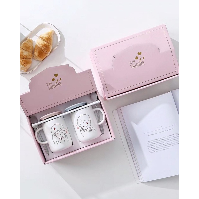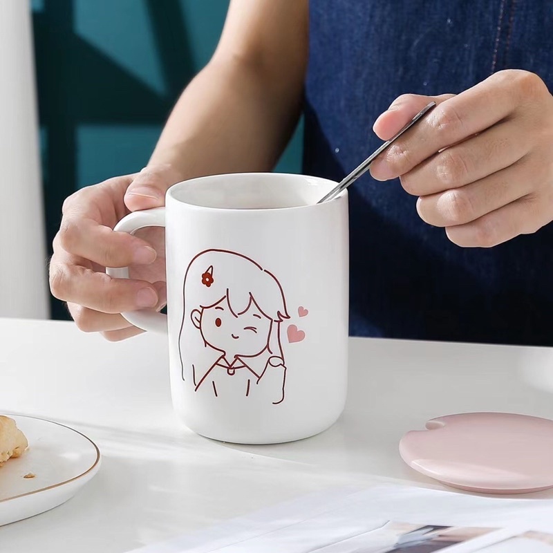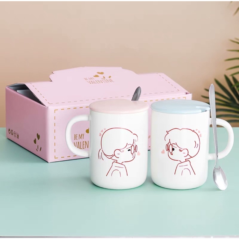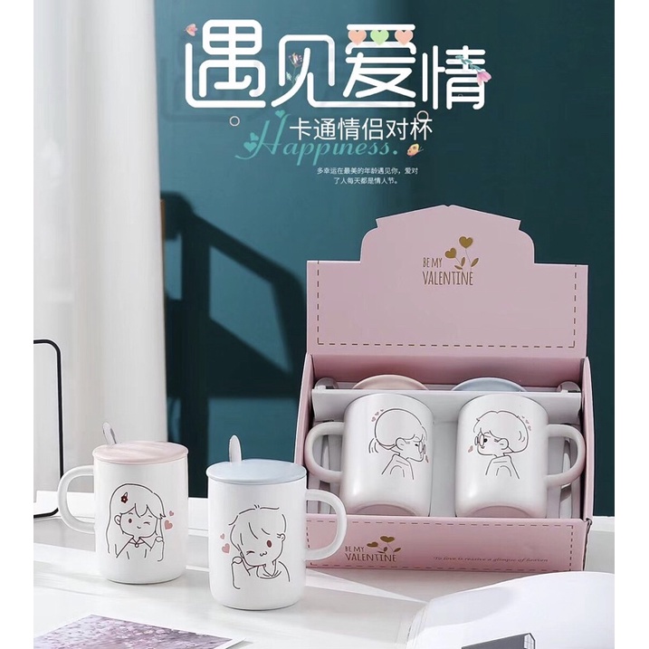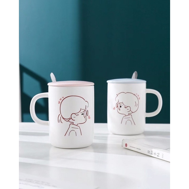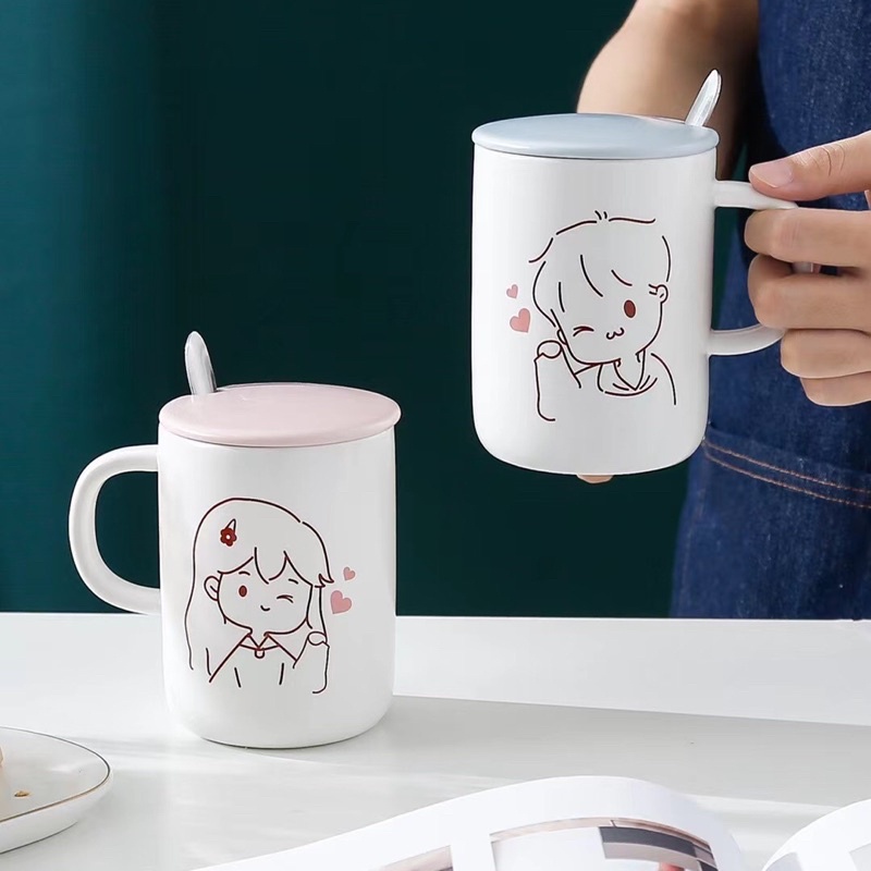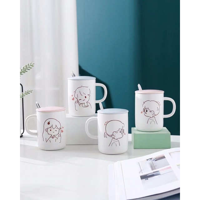 SET GELAS KERAMIK KARTUN PASANGAN MUG COUPLE DENGAN PENUTUP DAN SENDOK KADO PERNIKAHAN
