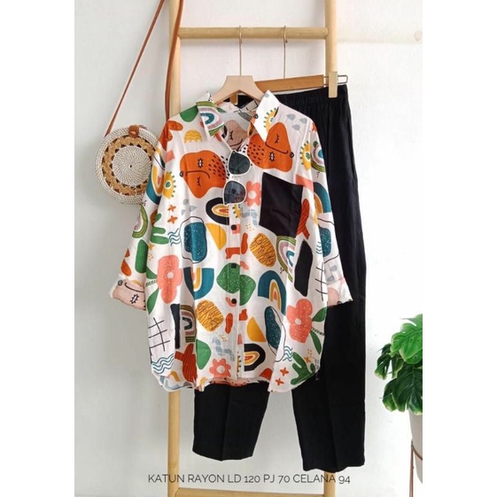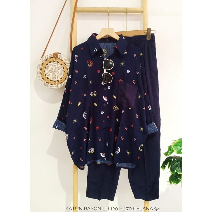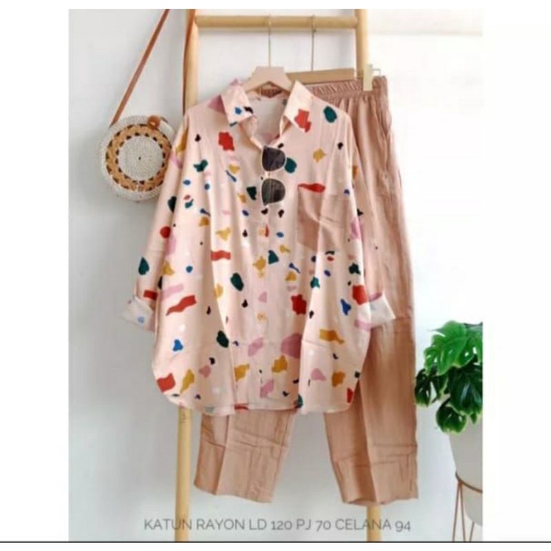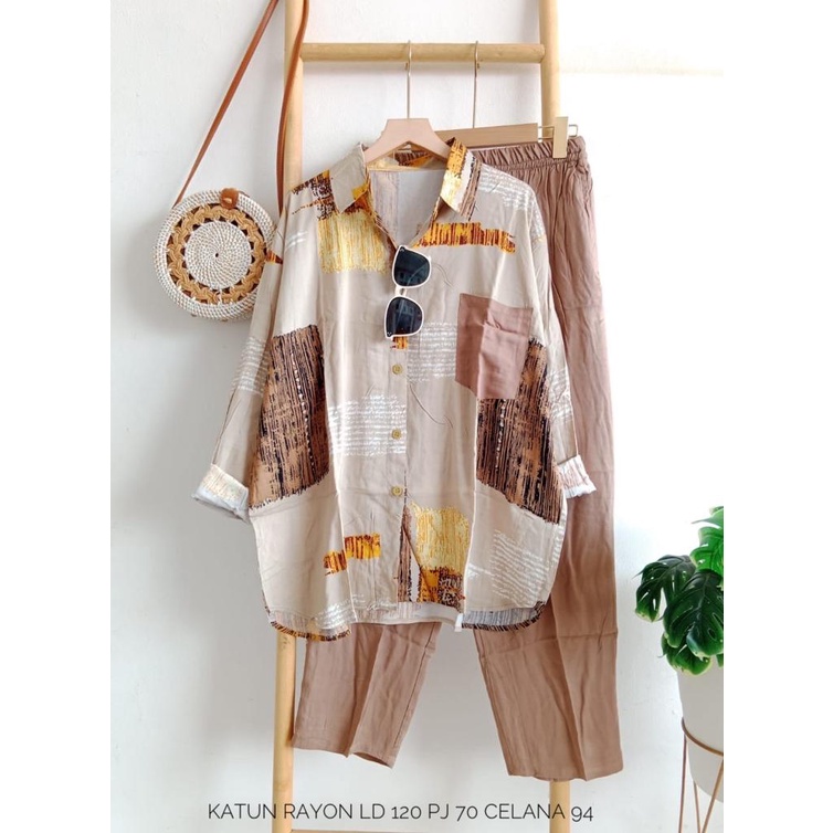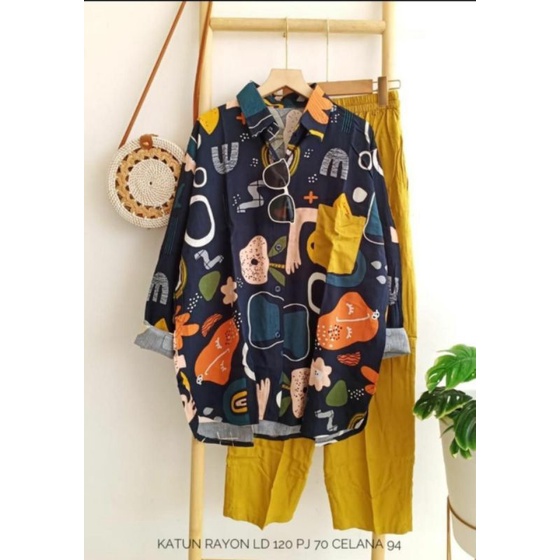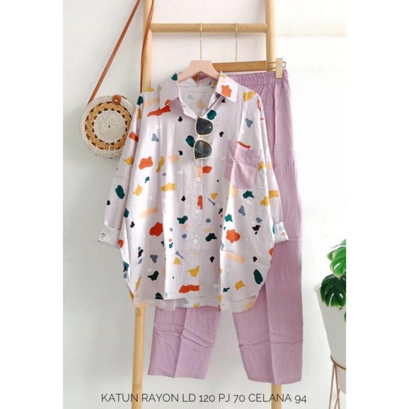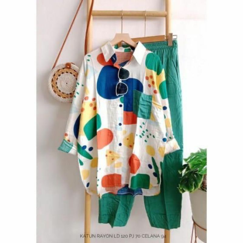 SETELAN KEMEJA WANITA MOTIF KEKINIAN / SETELAN RAYON PREMIUM HQ / SETCEL JUMBO / ONESET DAILY