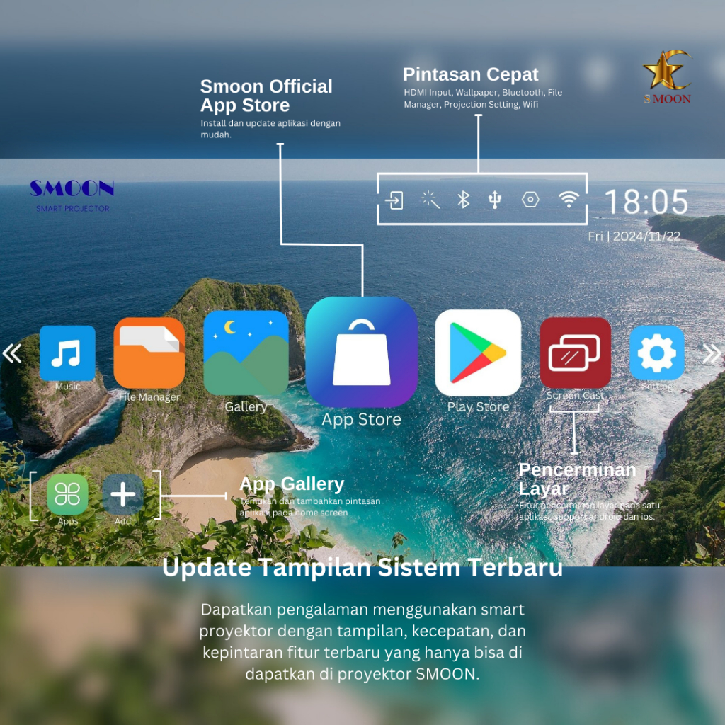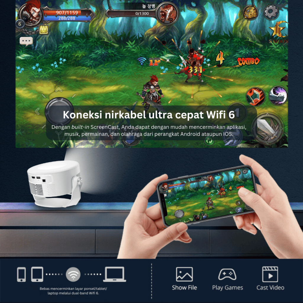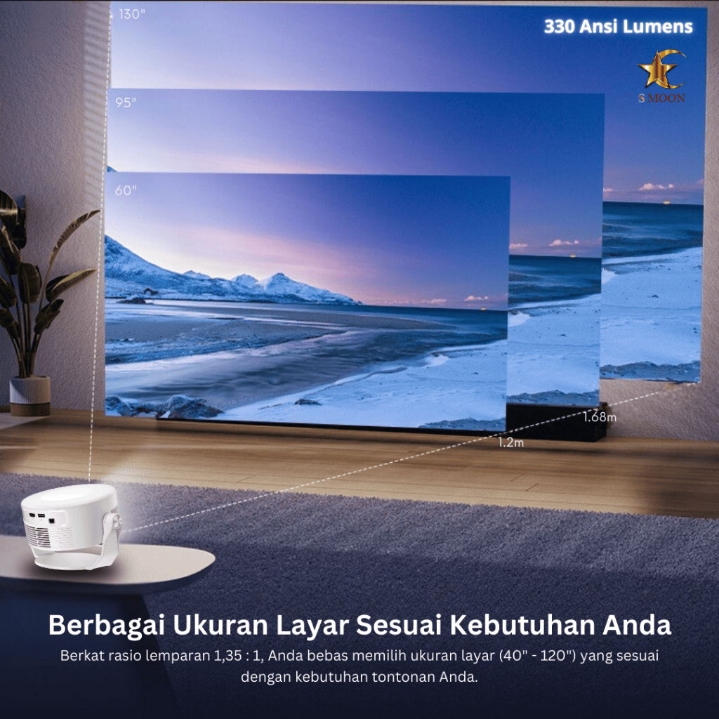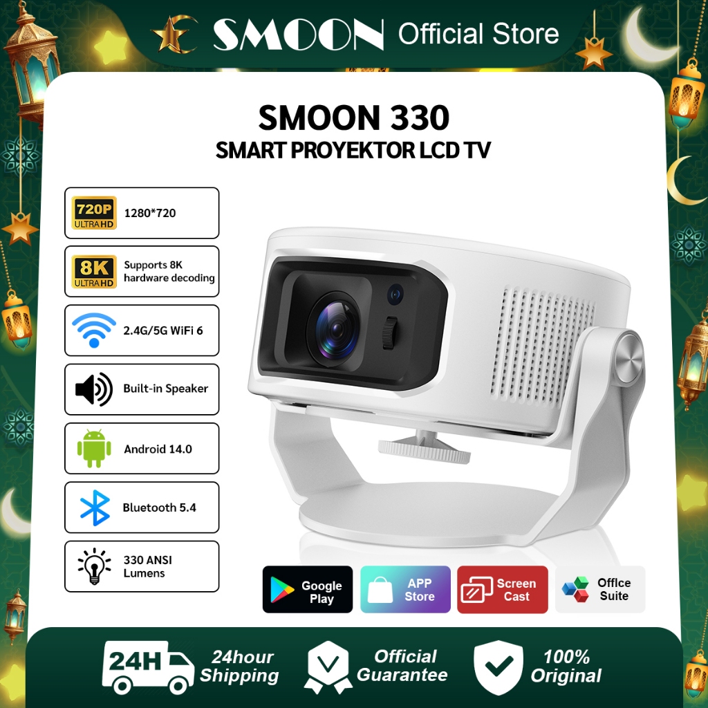 SMOON 330 Projector LCD TV - Proyektor Pintar - 330 ANSI Lumens - TV Android - Fokus Otomatis - Netflix - Google TV - YouTube - Include Kabel HDMI