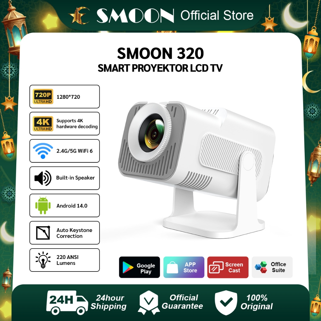 SMOON 320 Projector LCD TV - Proyektor Pintar - HY320 - 220 ANSI Lumens - TV Android - Fokus Otomatis - Netflix - Google TV - YouTube - Include Kabel HDMI