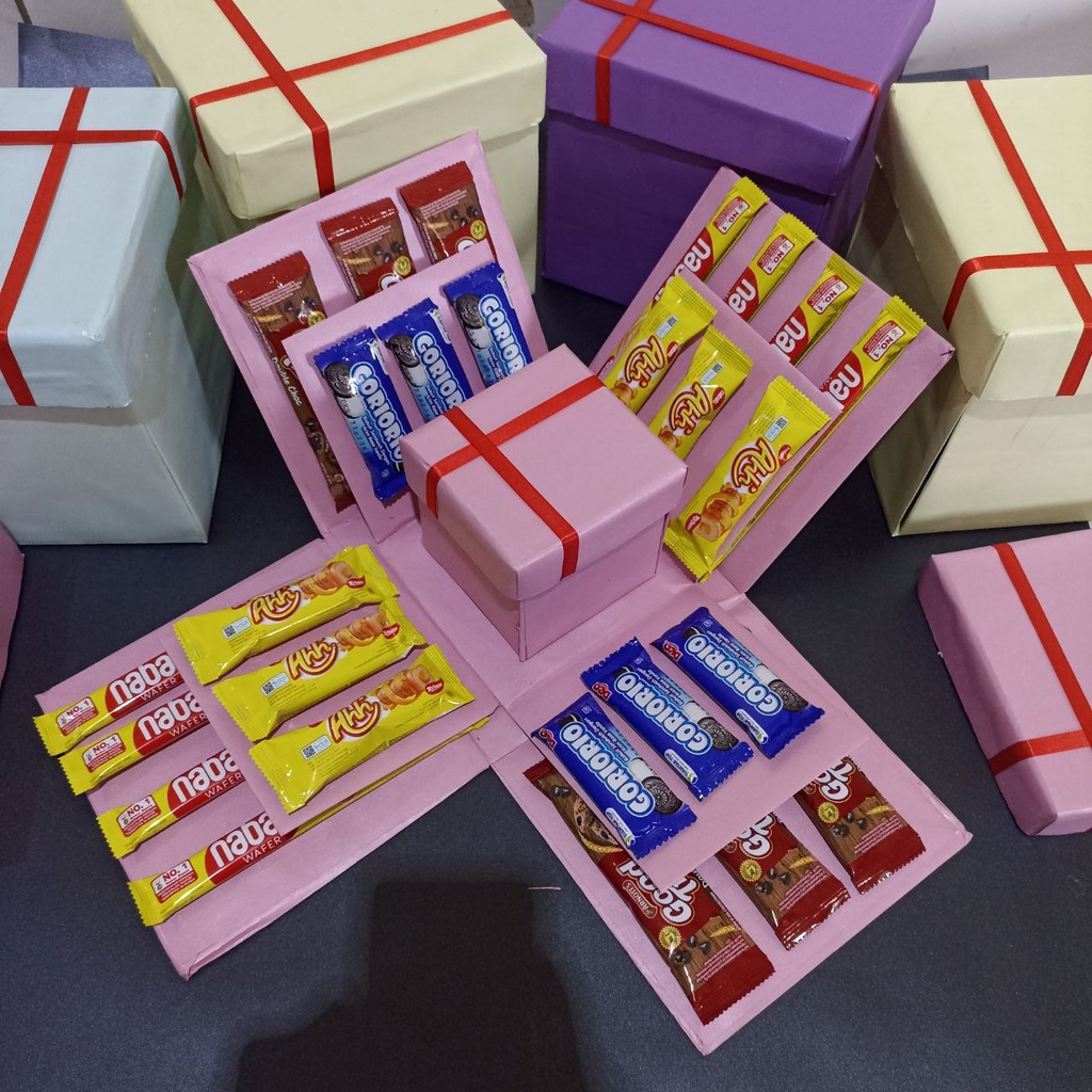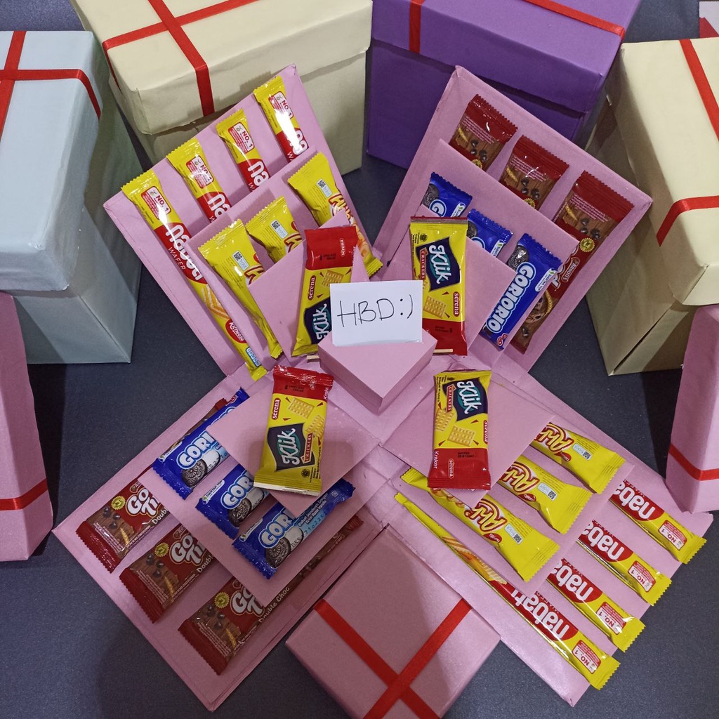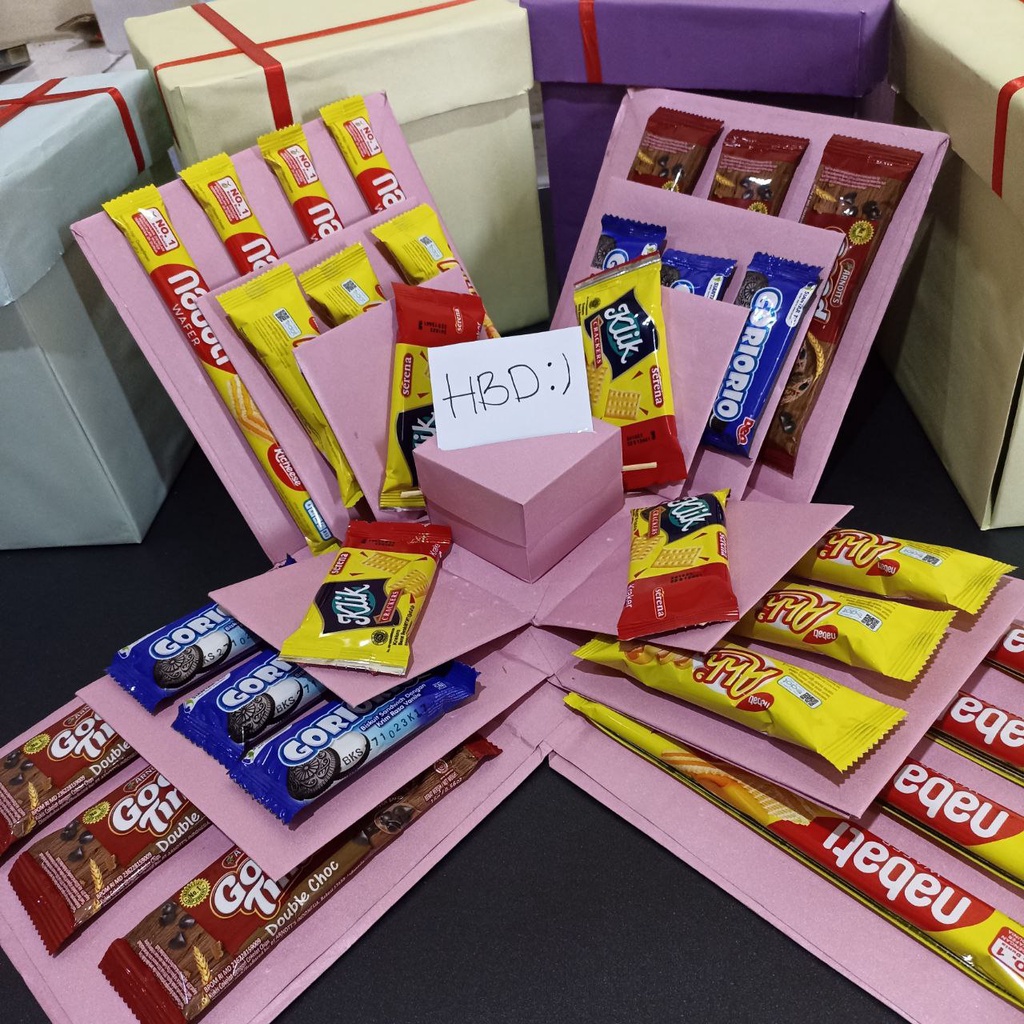 SNACK BOX, EKSPLOSION BOX SNACK , BOX UANG, KADO ULANG TAHUN CEWEK PAKET BOX, KADO ULTAH WANITA, GIFT BOX 3 LAYER ADA TARIK UANG
