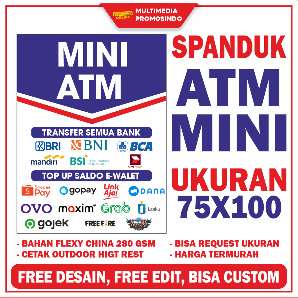 SPANDUK BANNER MINI ATM TARIK TUNAI BANK TRANSFER TOP UP E WALLET ( FREE DESAIN ) bahan Flexi 280Gram, Banner/Baligho/Backdrop