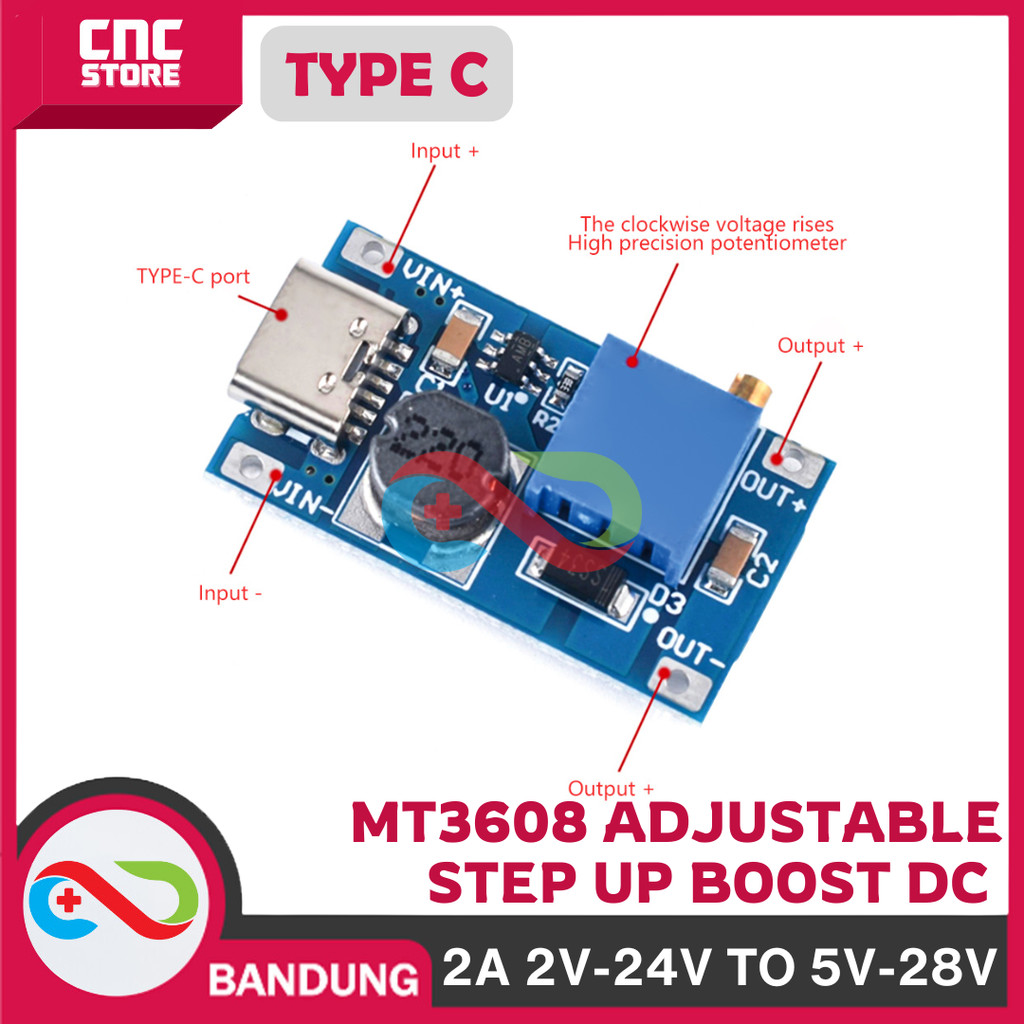 STEP UP MODULE BOOST DC DC TYPE C MT3608 ADJUSTABLE 2A 2V-24V TO 5V-28V