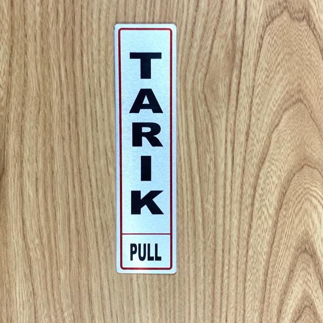 BAHAN ALUMINIUM RAMBU PERINGATAN TARIK DORONG PINTU JANGAN DIBANTING AWAS KACA KELUAR EXIT DLL