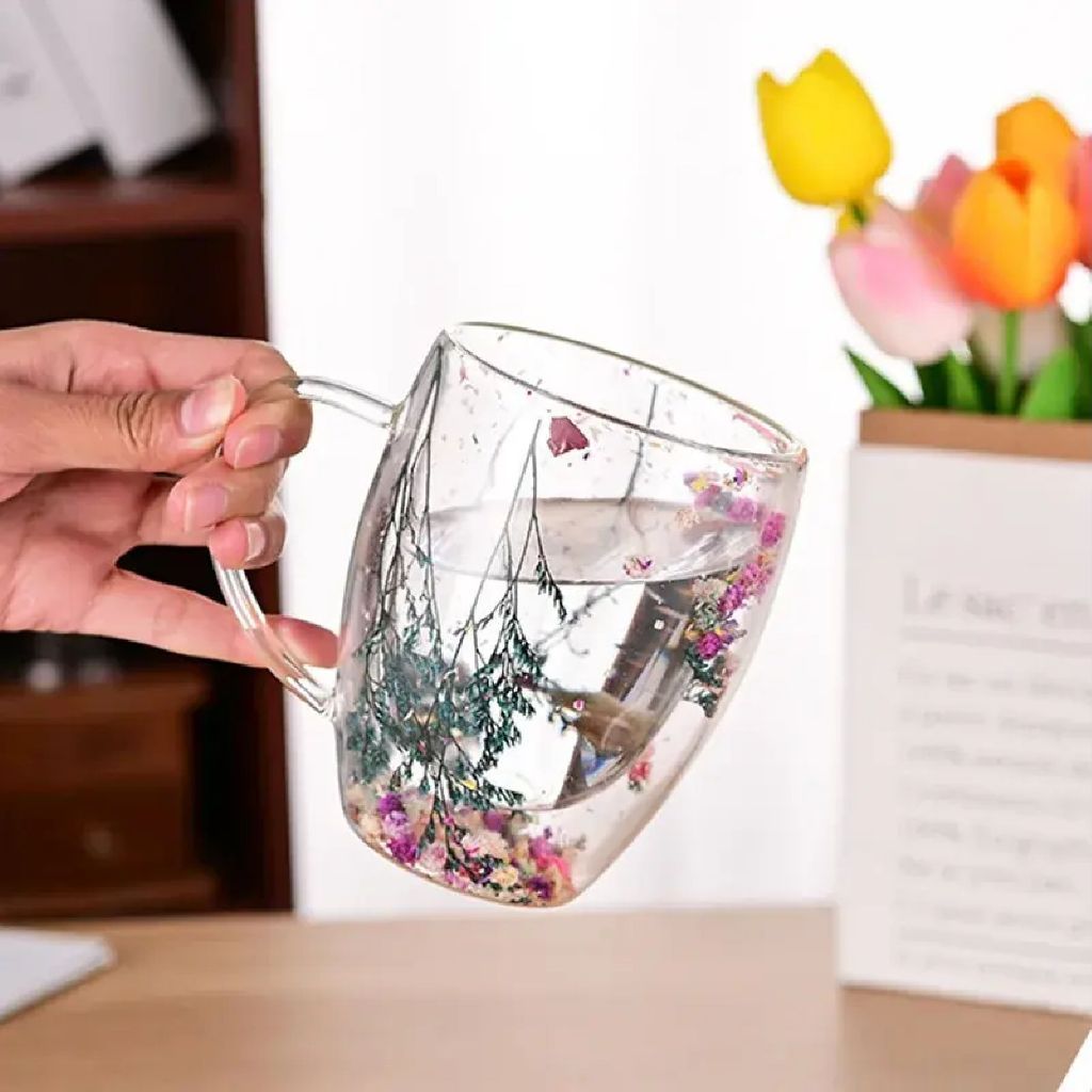 SUPERMARKET IMPORT Gelas Kaca Cangkir Kaca Dua Lapisan Gelas Minum Gelas Aesthetic Bunga Batang Bulat-Bulat Cangkir Kopi Anti Panas Double-Wall Glass Round Cangkir Aesthetic