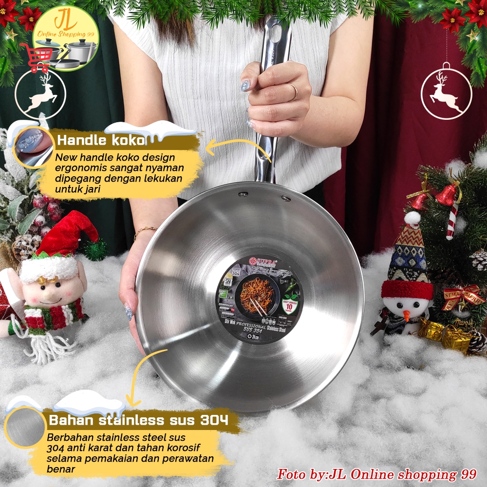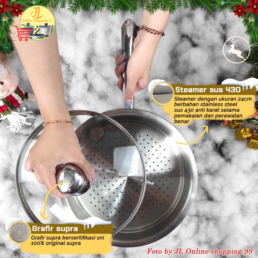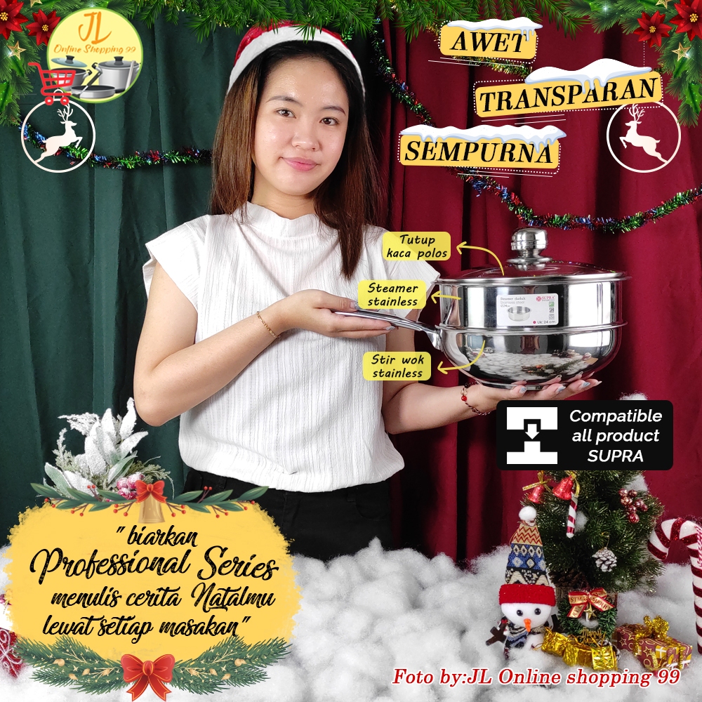 SUPRA Panci stir wok set 24cm + steamer + tutup kaca viliron stainless steel SUS 304 professional chef series / penggorengan wajan dan kukusan