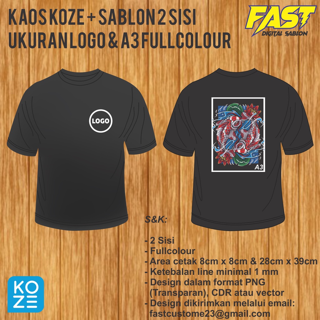 Sablon kaos custom satuan / kaos koze + sablon 2 sisi ukuran logo & A3 fullcolour