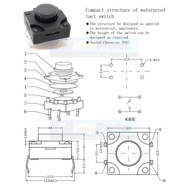 Saklar Waterproof Tact Switch 12x12mm Saklar Tombol Tekan 12*12 Tactile IP67
