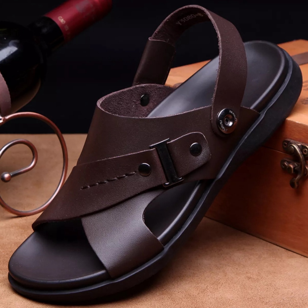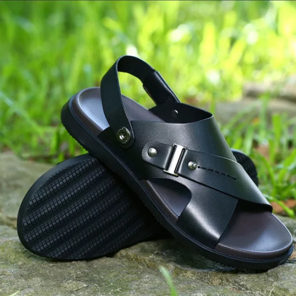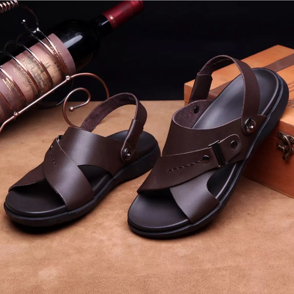 Sandal Pria Kulit Impor Slip On Trendy Terbaru Model Open Toe
