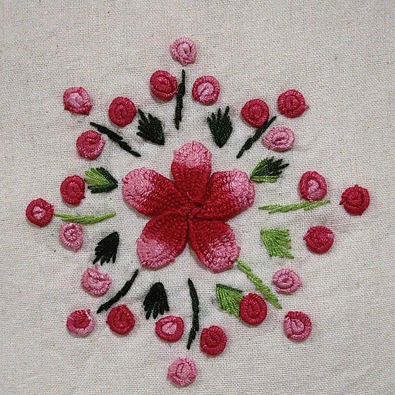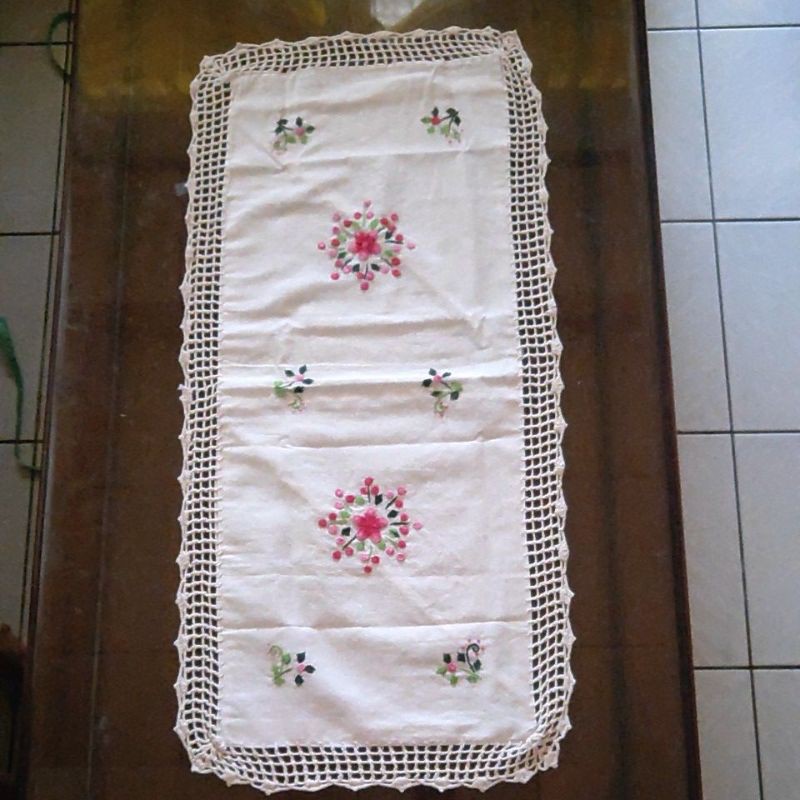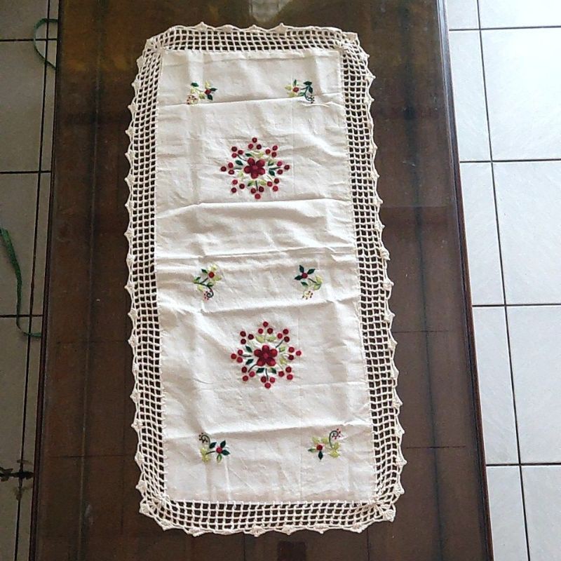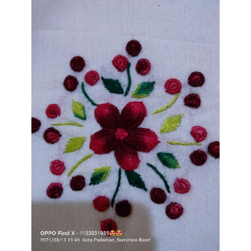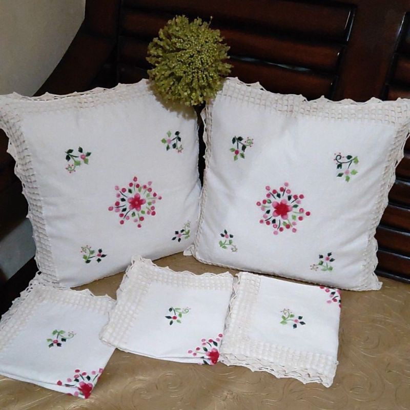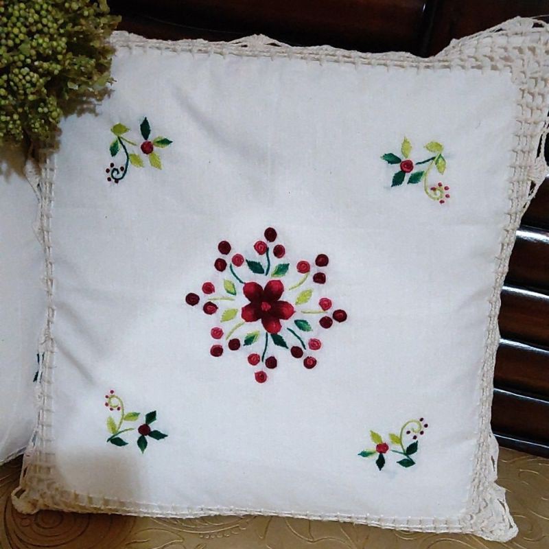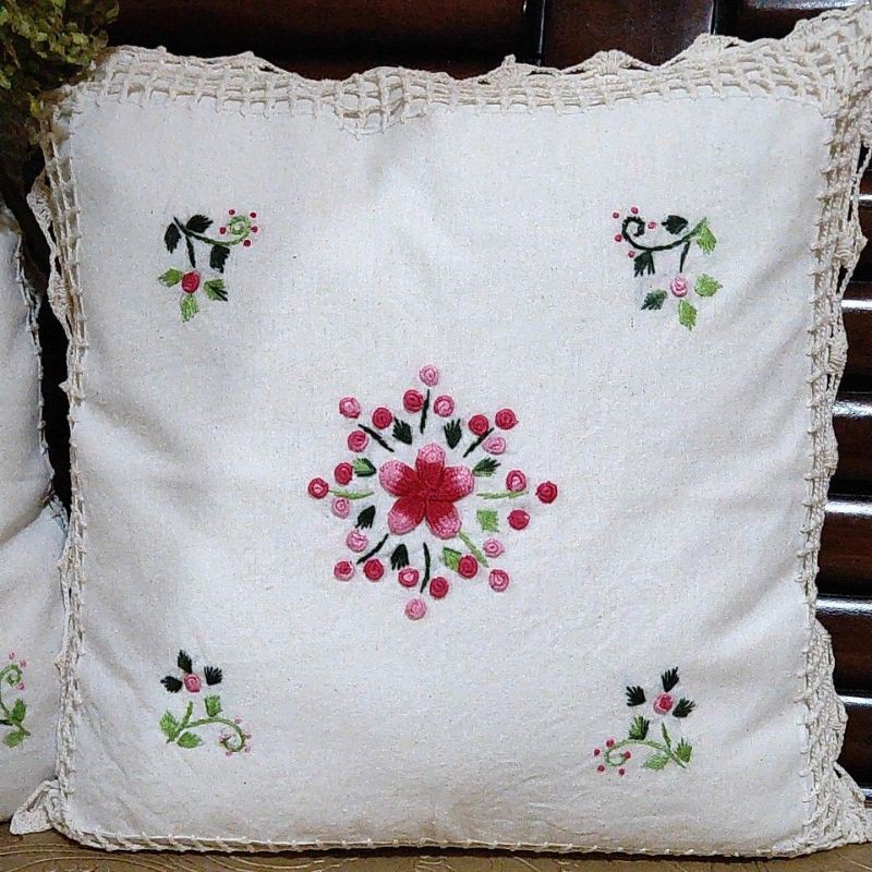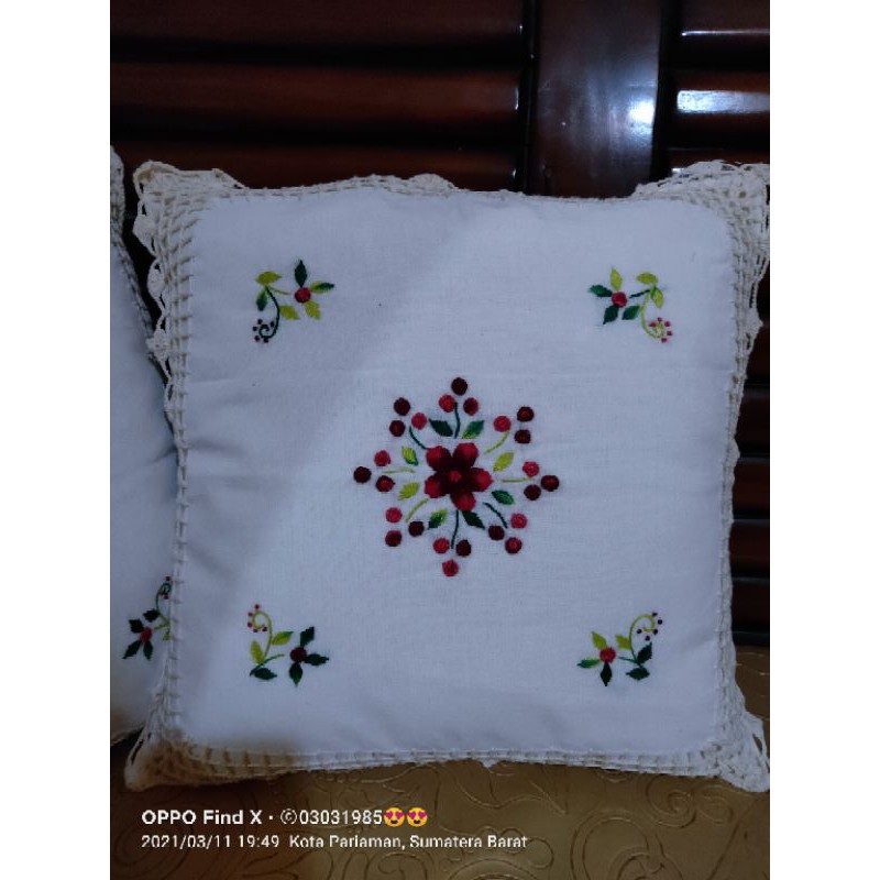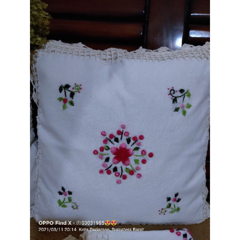 Sarung bantal kursi 40x40 rajutan kombinasi sulaman tangan pada kain blacu