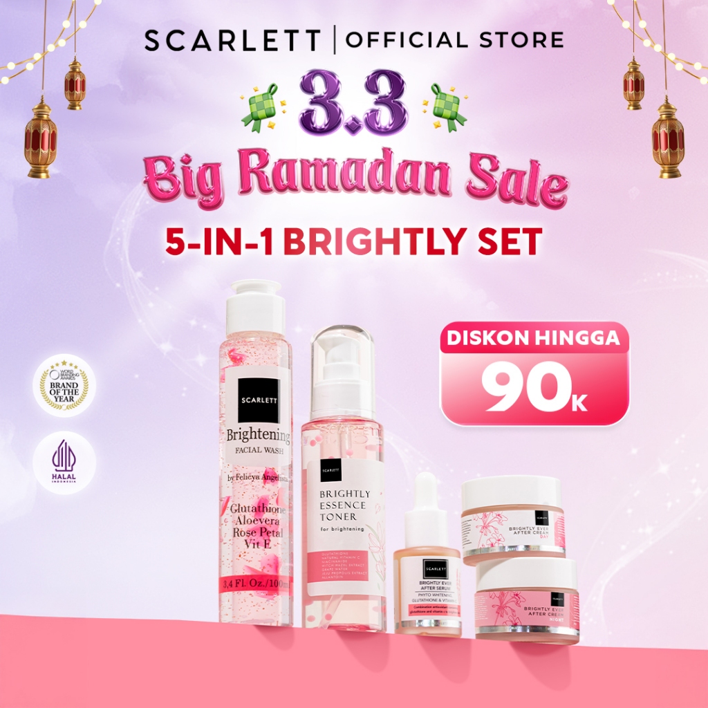 SCARLETT Brightly Ever After Series - Paket Lengkap Mencerahkan Wajah 5in1-Brightening Moisturizer +Serum+Cleanser+Toner+Krim Pagi+Krim Malam | Niacinamide Vitamin C Gluthatione