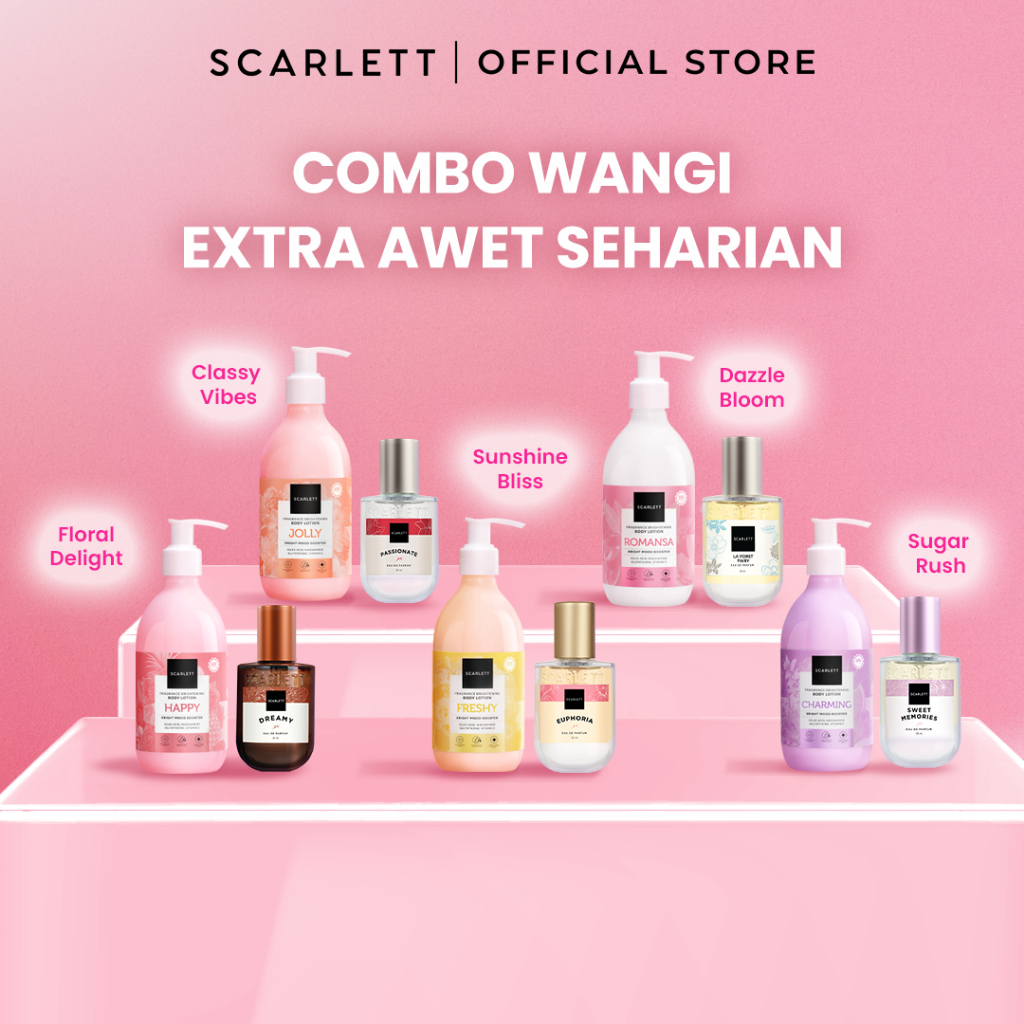SCARLETT Fragrance Brightening Body Lotion Bright Mood Booster 300ml +4 Essential Oils 3X Brightening Power | Solusi Untuk Kulit Kering | Menenangkan, Mencerahkan Kulit, Wangi Tahan Seharian