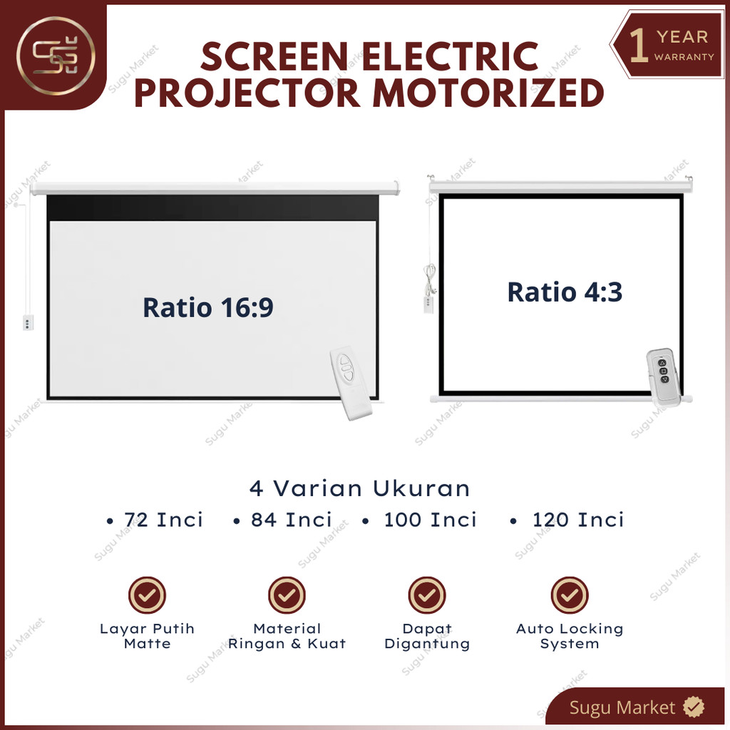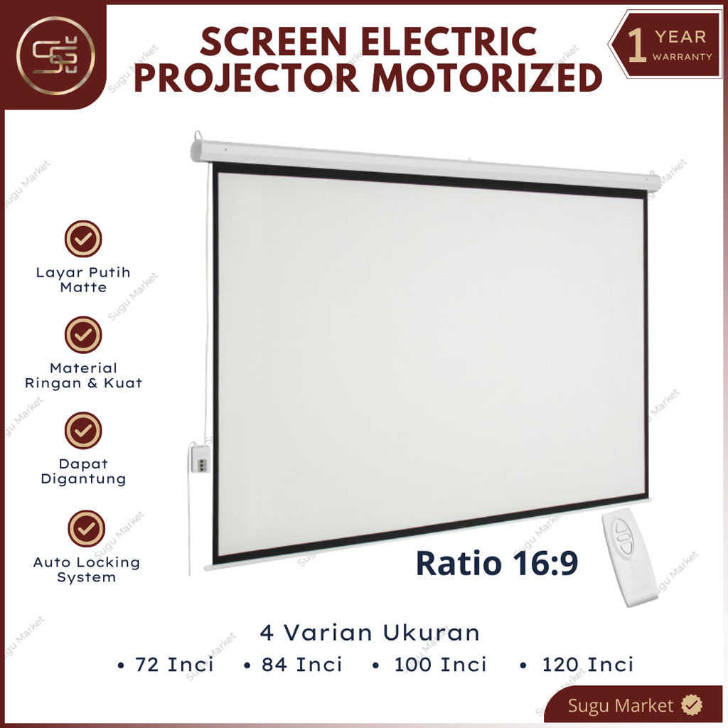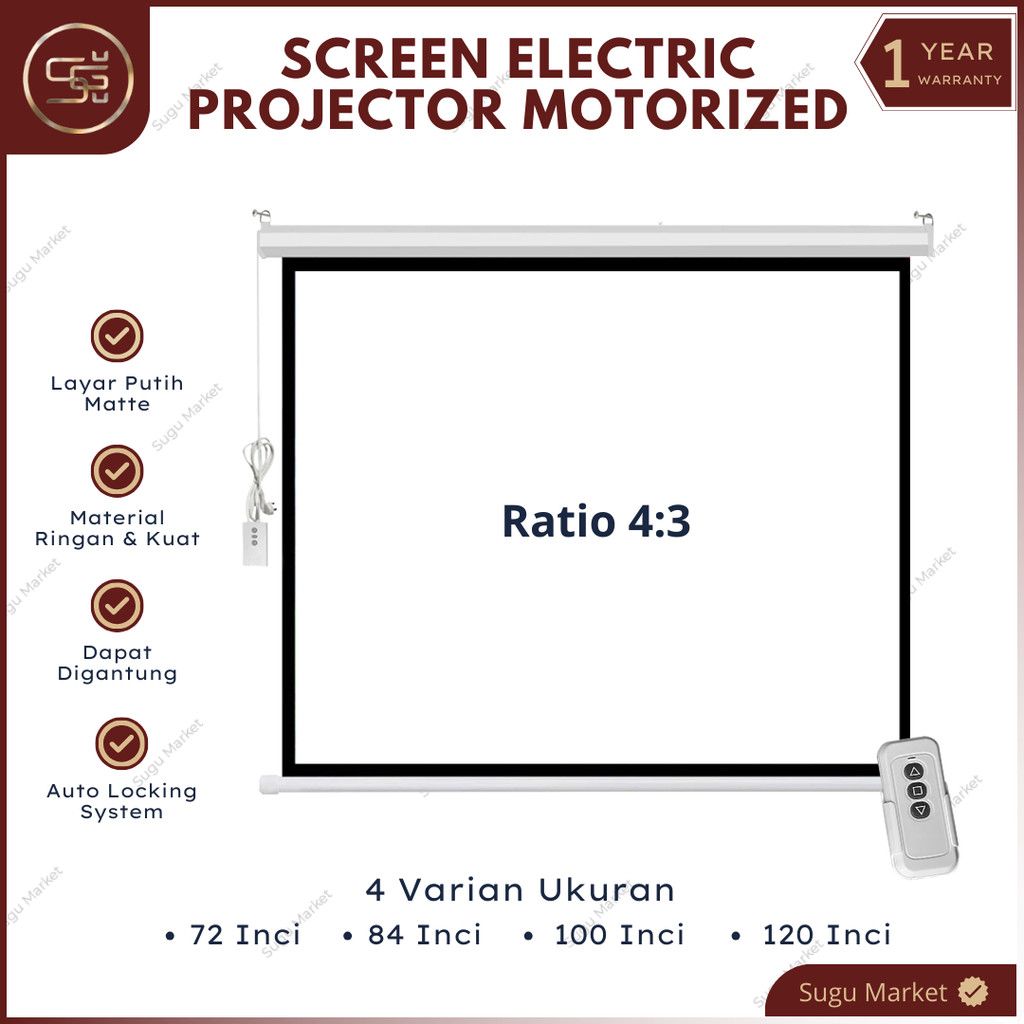 Screen Projector Motorized Electric With Remote "72-84-100-120" Ratio 16:9 dan 4:3 | Layar Proyektor Gantung Otomatis