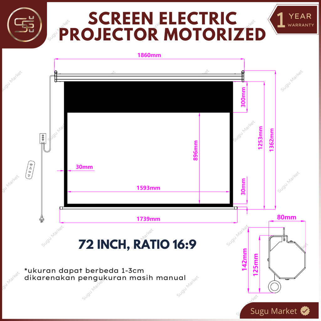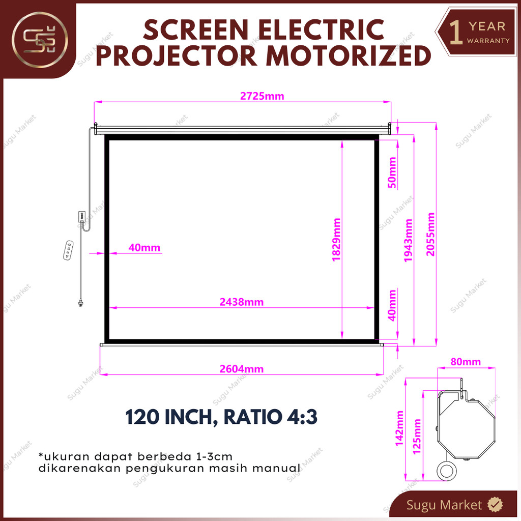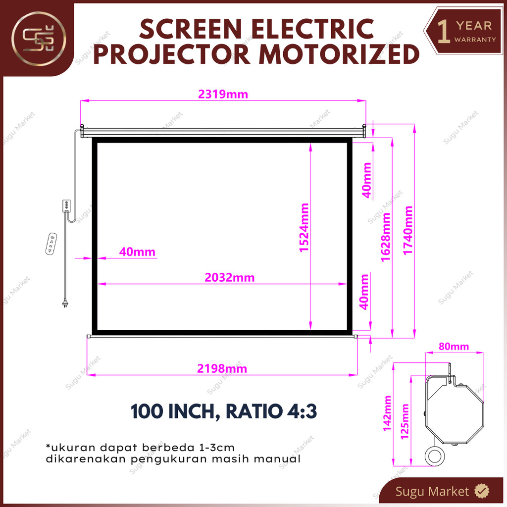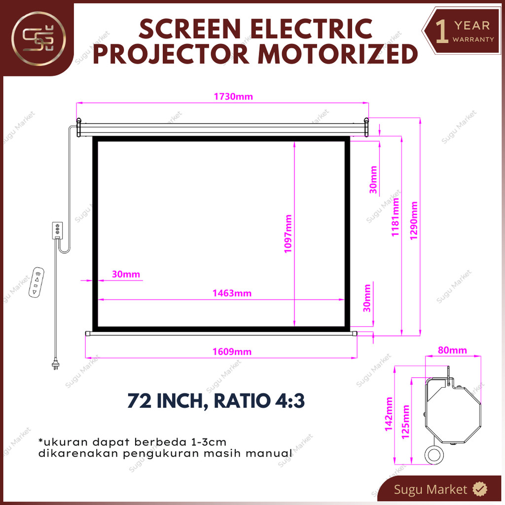 Screen Projector Motorized Electric With Remote "72-84-100-120" Ratio 16:9 dan 4:3 | Layar Proyektor Gantung Otomatis