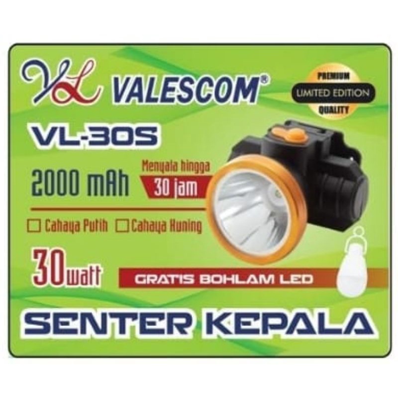 Senter Kepala Valescom 30 Watt VL-30S Cahaya Putih / Kuning + Gratis Bohlam Lampu LED