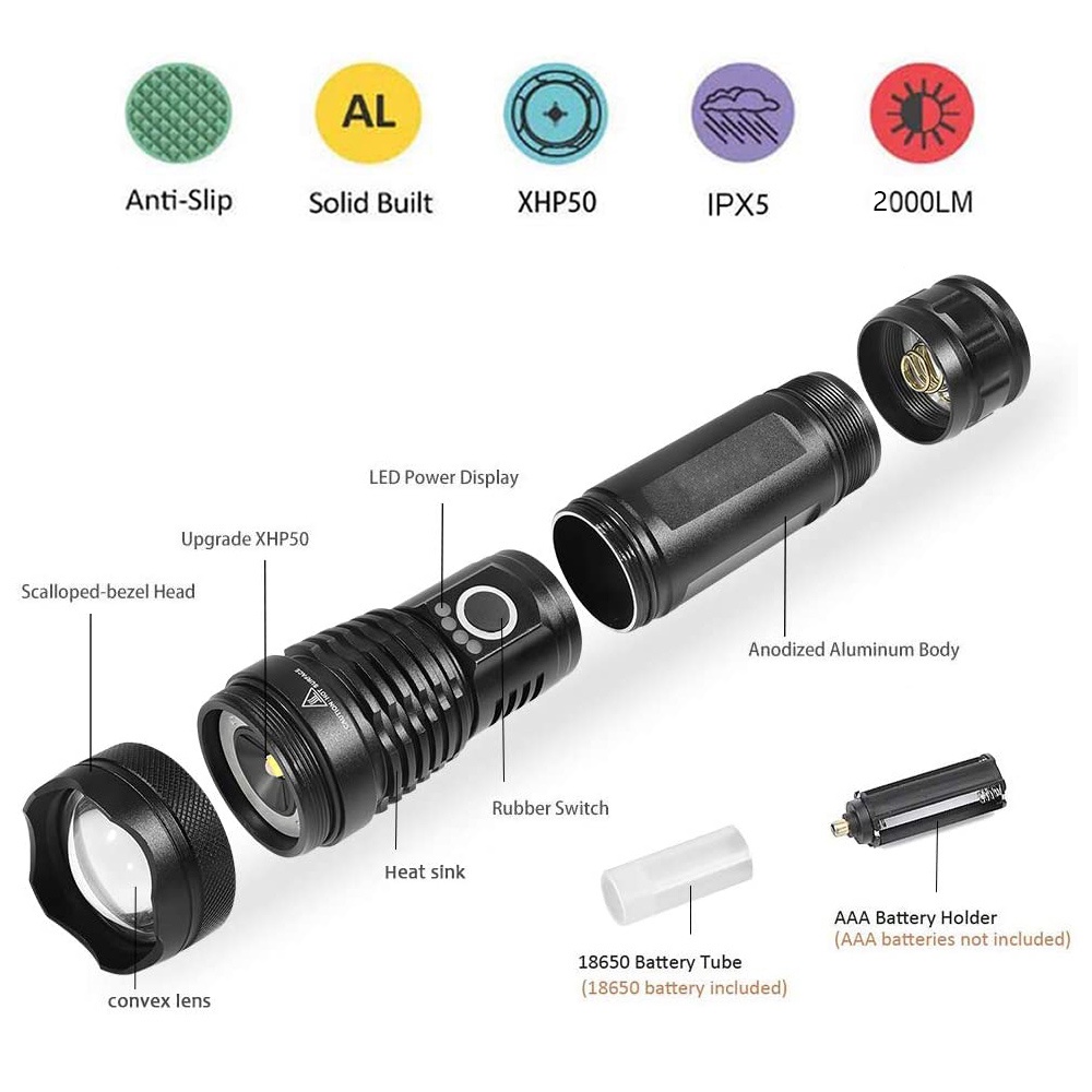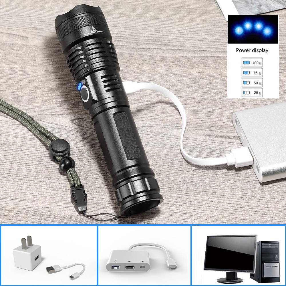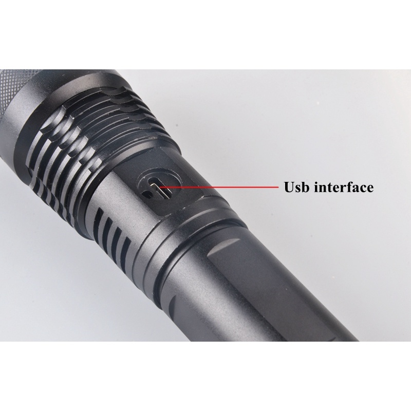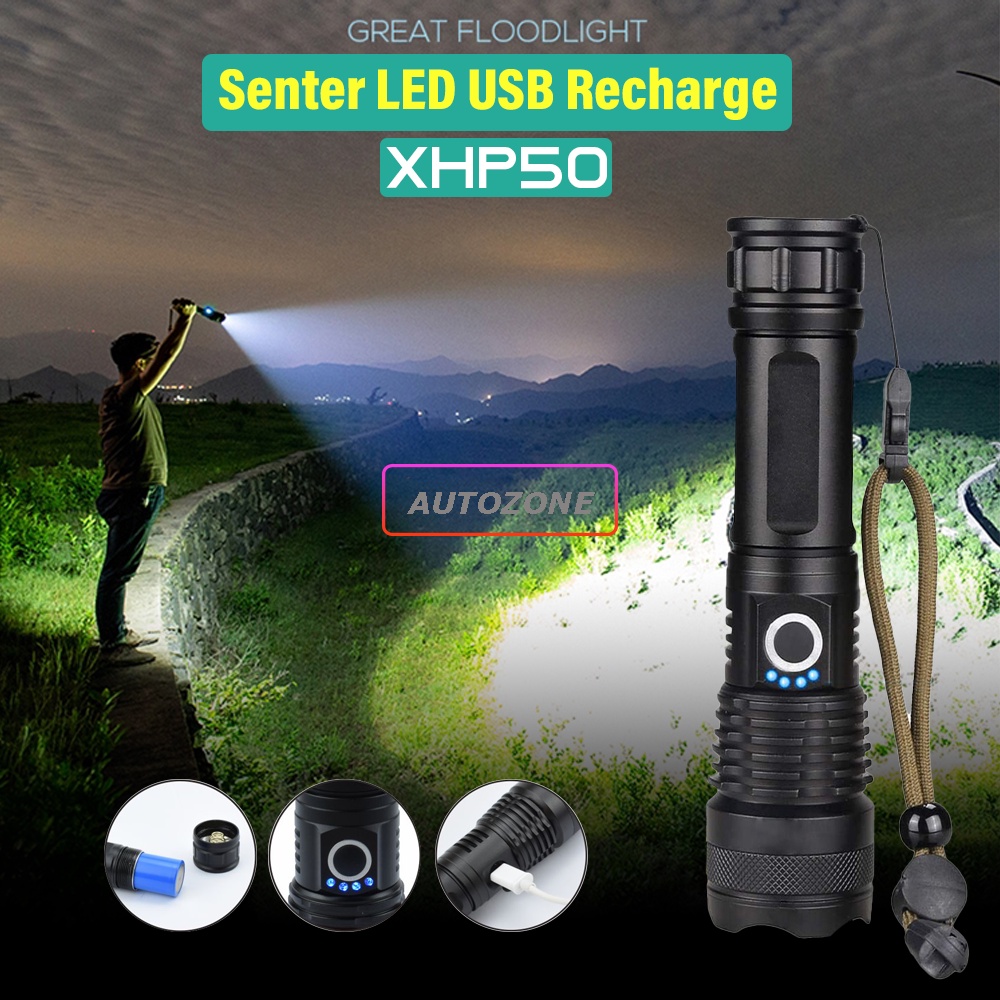 Senter LED Cas Zoom Tactical USB Recharge XHP50 EU Adaptor Lampu Senter Swat Police Super Terang Jarak Jauh 2Km Paling Terang Dan Kuat 2000 Meter Awet Dan Tahan Lama Lengkap Dengan Baterai Dan Charger