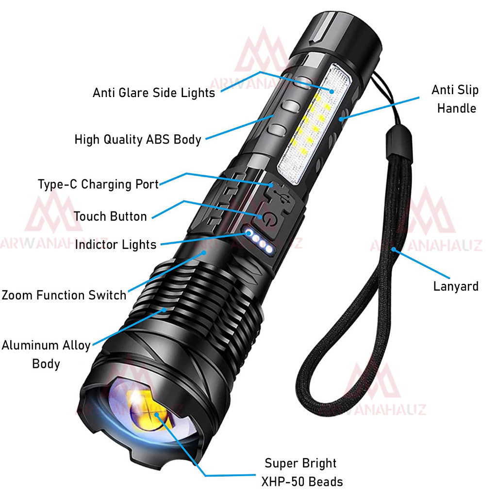 Senter LED Super Terang 10000 Lumens Jarak Jauh Ringan Tahan Air Zoom USB Rechargeable Senter Swat Police Terbaik Paket lengkap Senter LED Tactical 100000 Lumens Xhp 50 - Kualitas Cahaya Super Terang