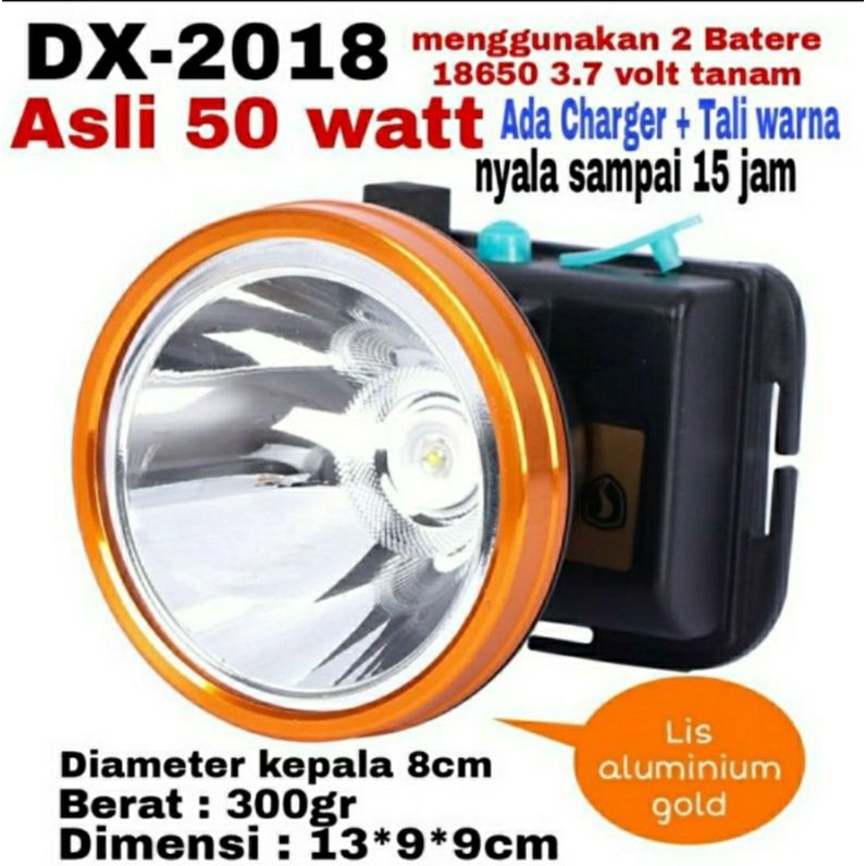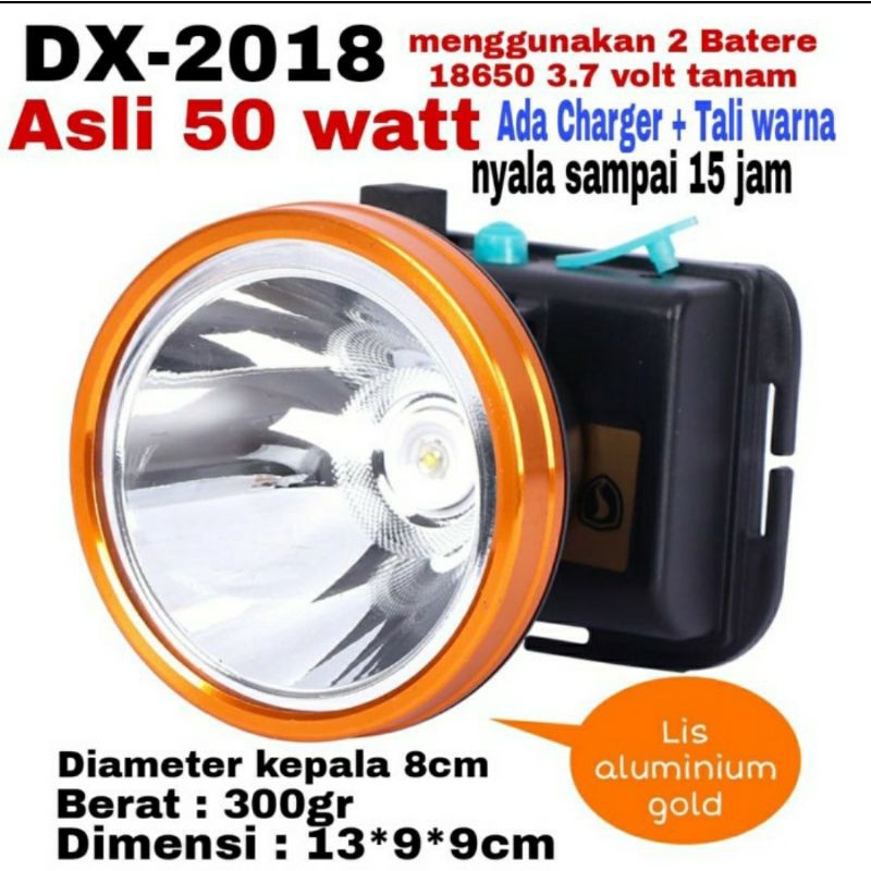 Senter kepala Led 50Watt Charger DX2018 Gold/ Senter Kepala Headlamp 50Watt Super Terang