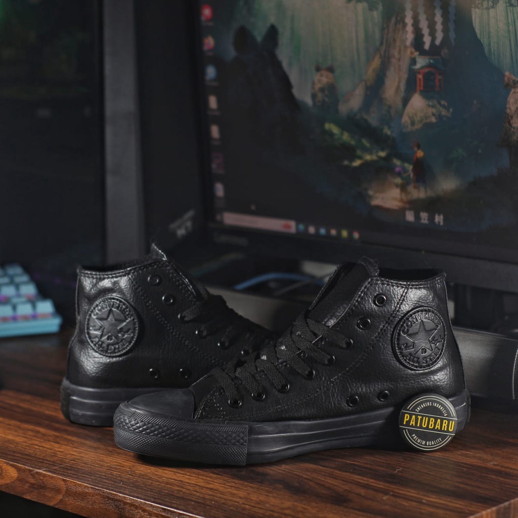 Sepatu Kulit Converse all Star High Full Black Sepatu Kulit PRIA-WANITA Premium Import Vietnam BISA COD SELURUH INDONESIA