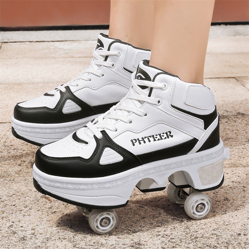 Sepatu Roda 2 Heelys Helis Lampu LED Menyala Charge deformasi Empat roda berjalan sepatu Dapat berjalan Skate roda sepatu New roller Skates Satu kunci Tukar