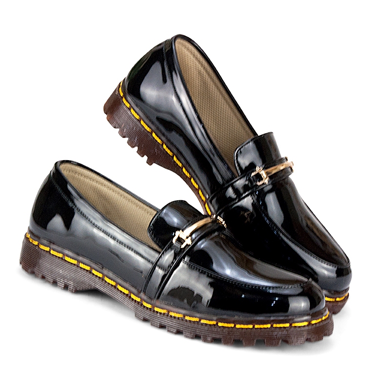 Sepatu kasual wanita model DocMart / Loafer Slip-on/ Kulit sintetis mengkilat hitam / HLC 093