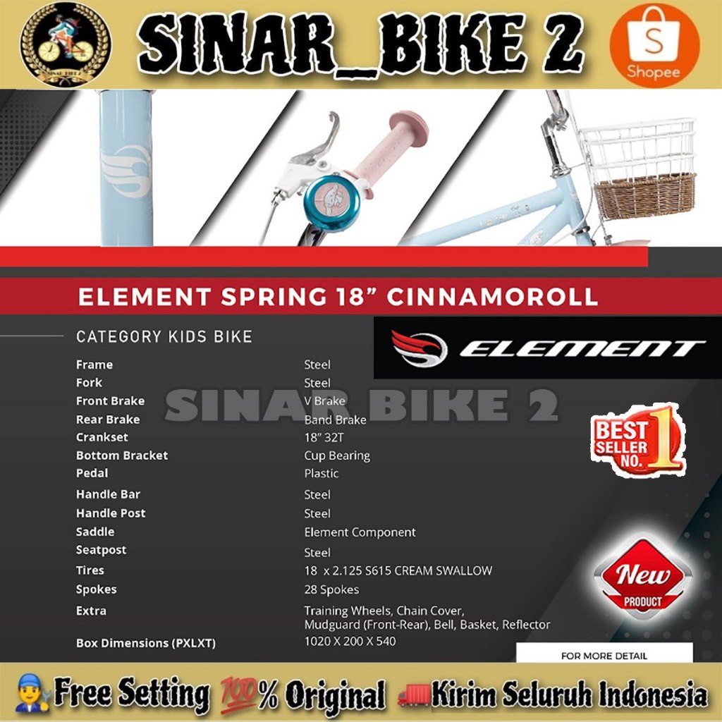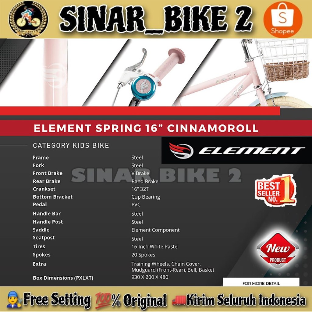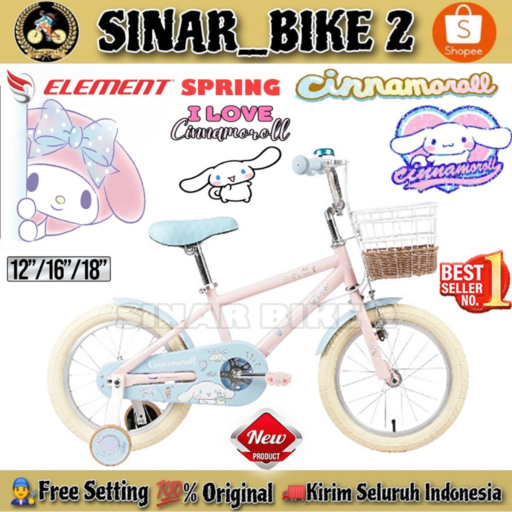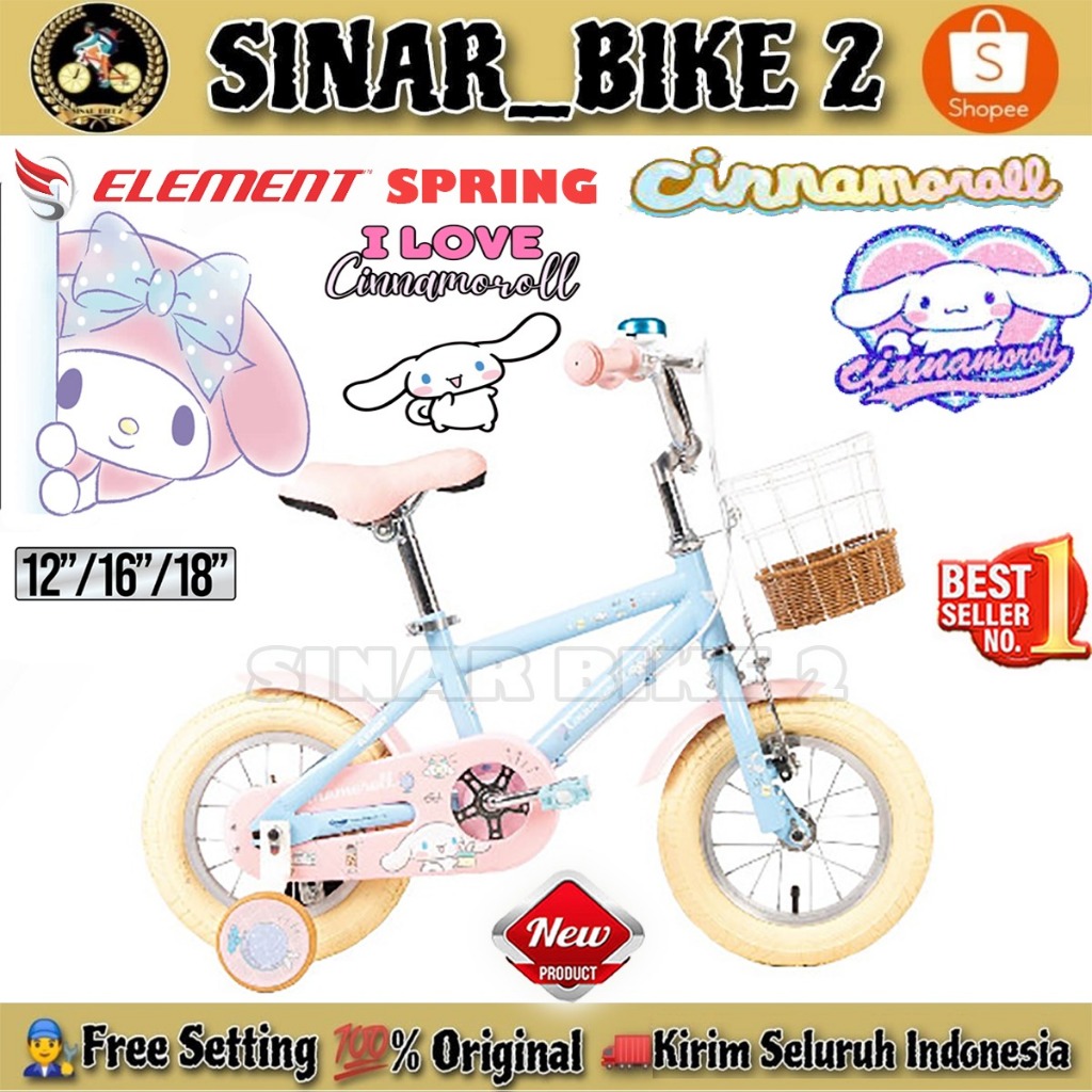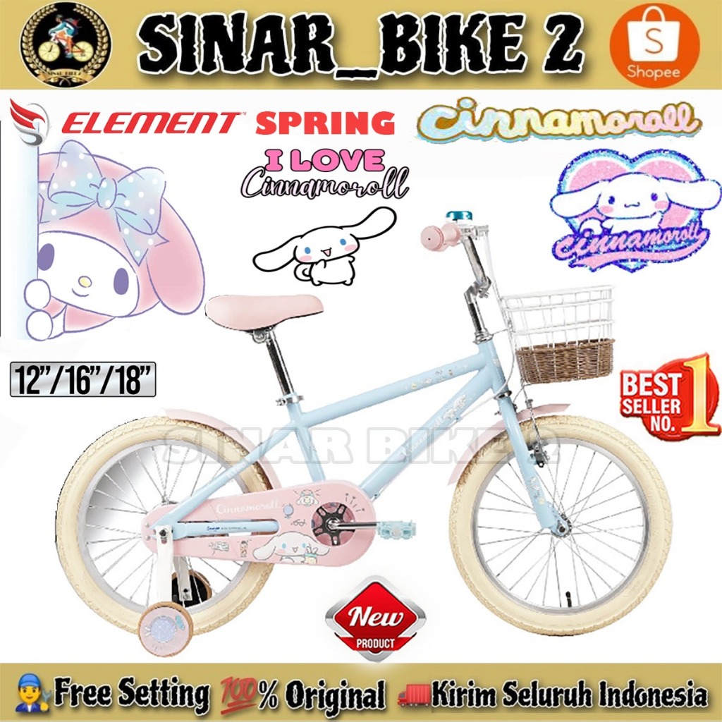 Sepeda Anak Perempuan ELEMENT SPRING CINNAMOROLL Ukuran 12 16 18 Inch Keranjang Usia 2-8 Tahun