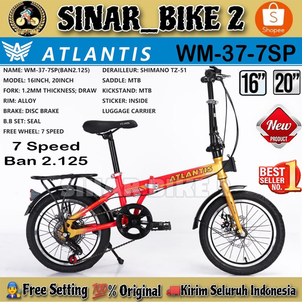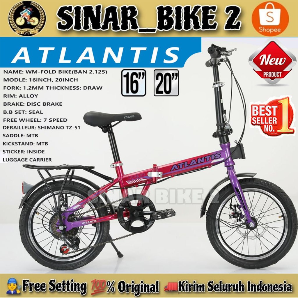 Sepeda Lipat ATLANTIS FOLD Ukuran 16 20 Inch Rem Cakram Boncengan 7 Speed Dewasa Anak