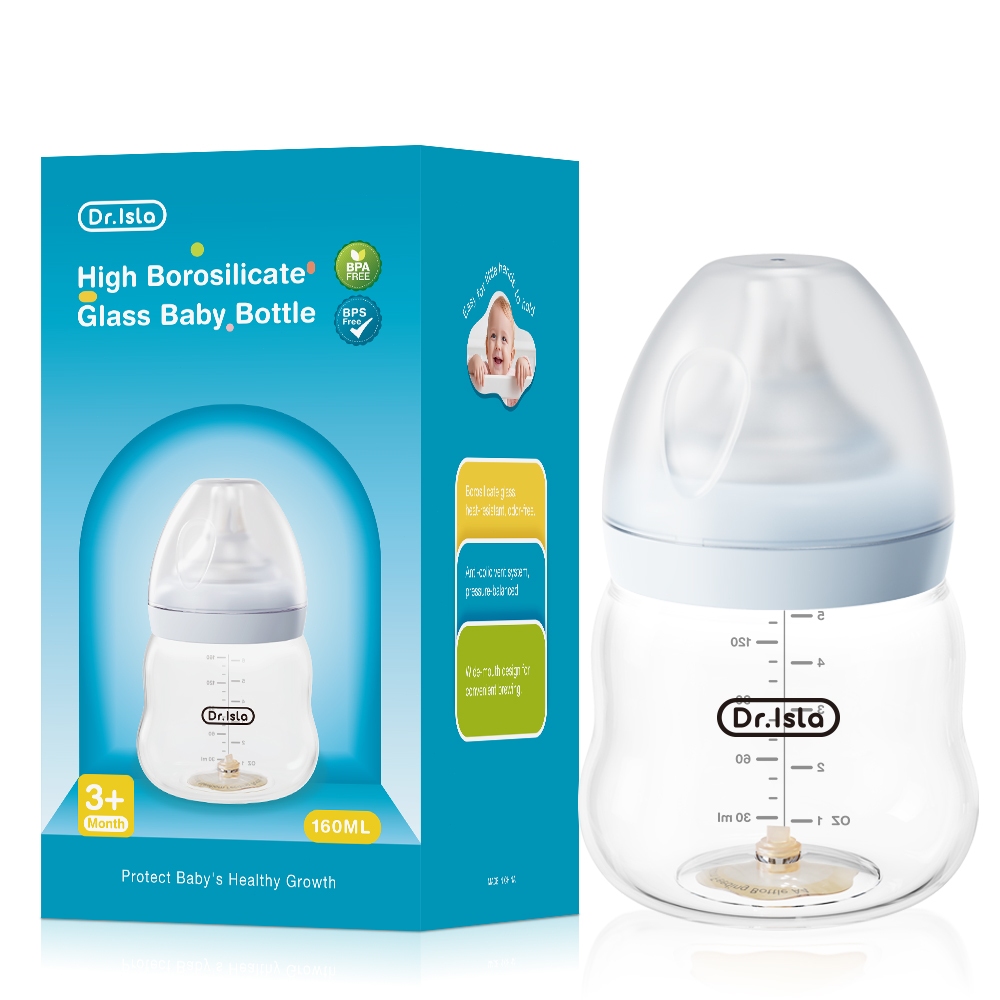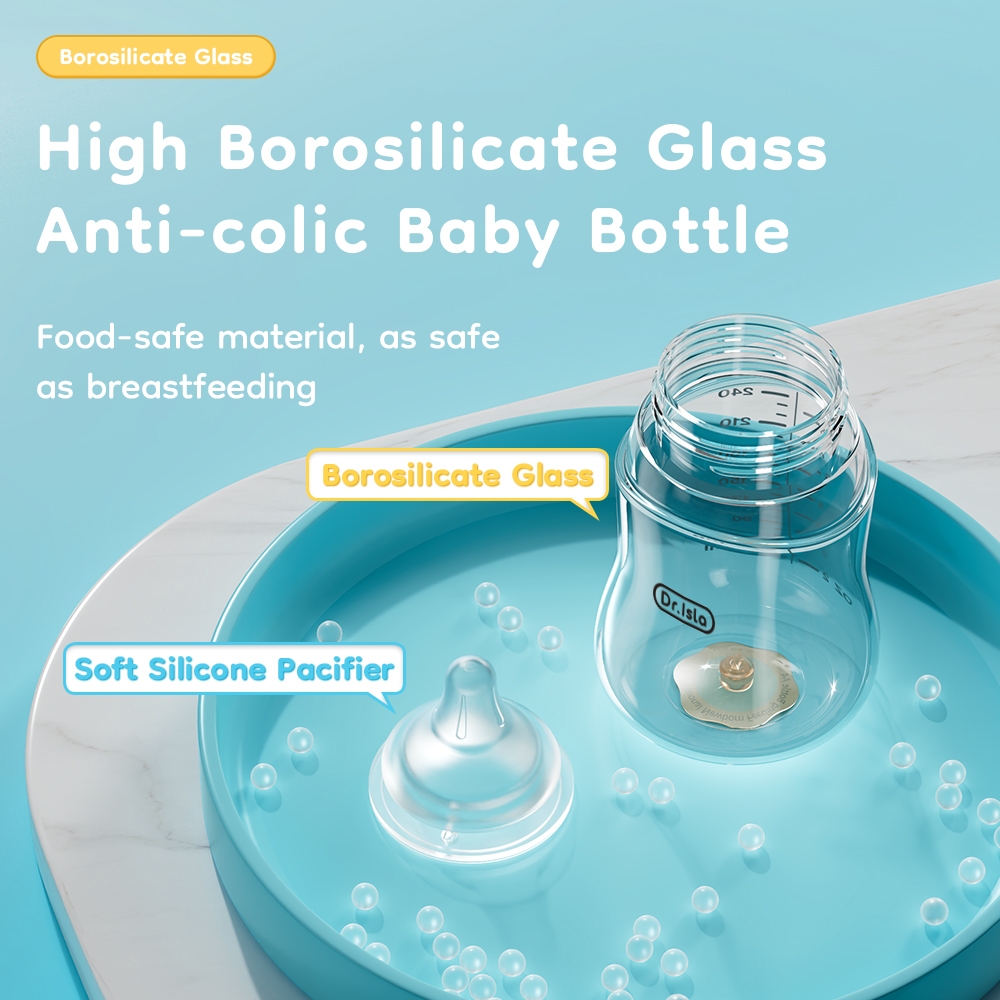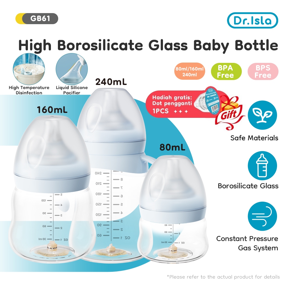 Dr.isla Dot Bayi Botol Susu Kaca 80ml 160ml 240ml Botol Minum Bayi BPA Free Anti Kolik suhu tahan panas-600° dengan garis skala yang terlihat Botol putting silikon cair lentur dan elastisitas tinggi GB61