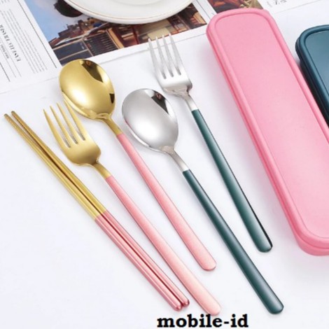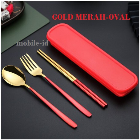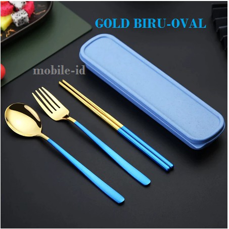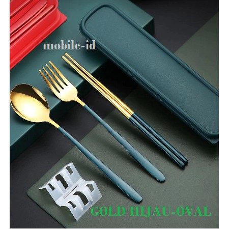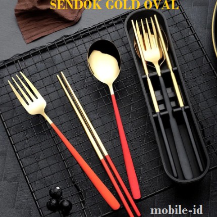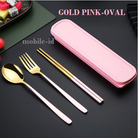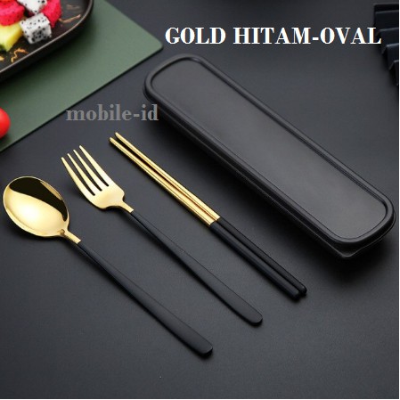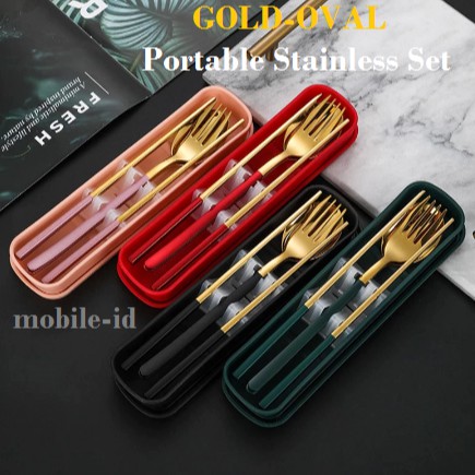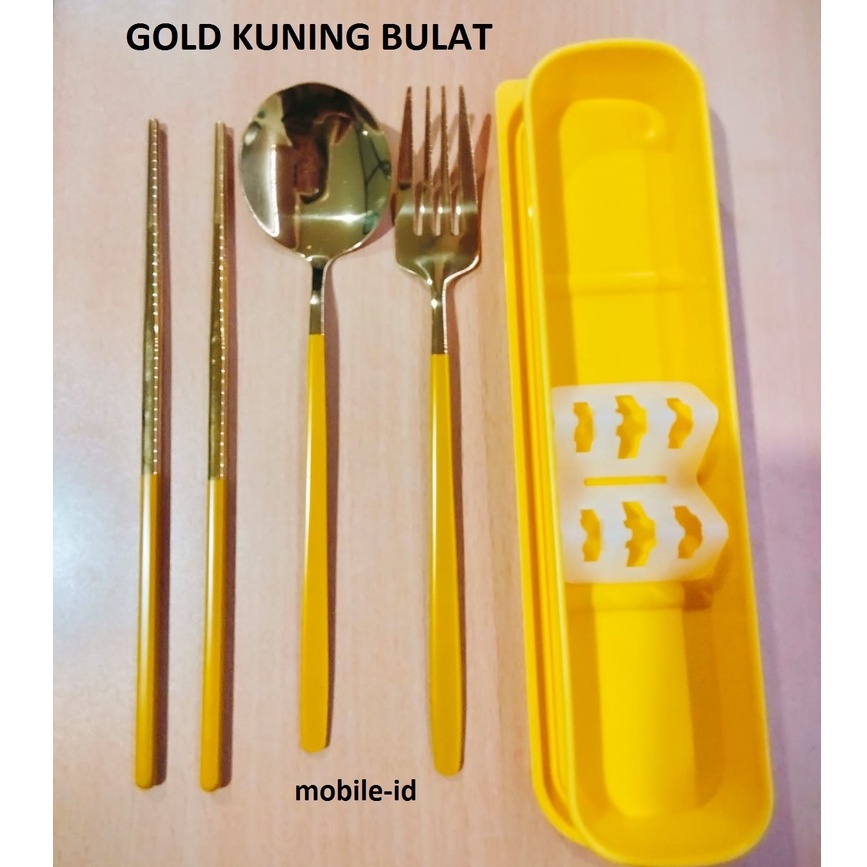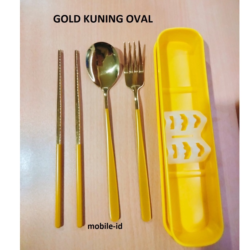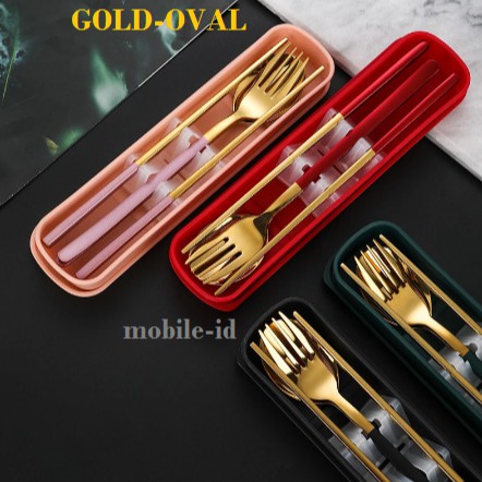 Set Alat Makan Korea Stainless Steel 410 Cutlery Set Box Sendok Garpu Sumpit Gold Oval 4 in 1 Portable