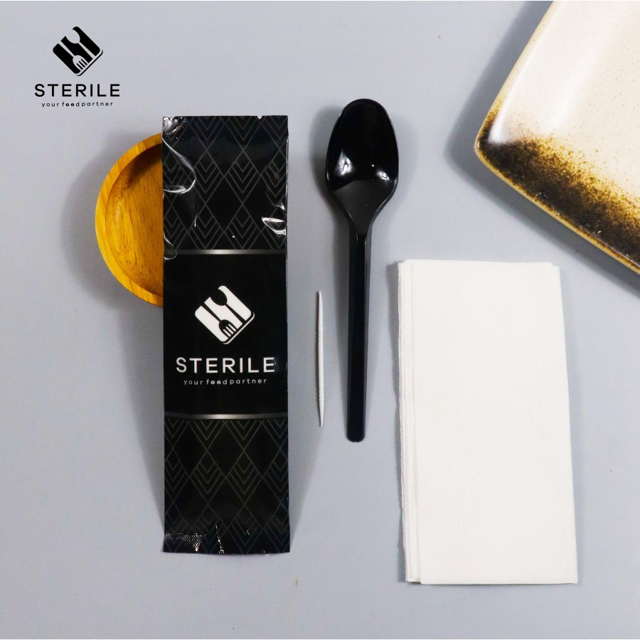Paket set sendok, garpu, tisu dan tusuk gigi plastik premium warna hitam