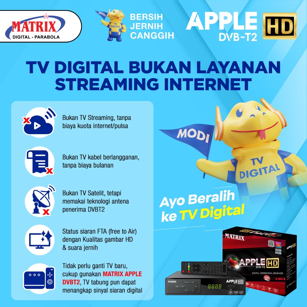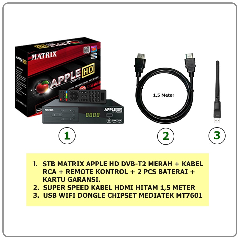 Set Top Box STB Receiver TV Digital Matrix Apple HD Merah DVB-T2 / USB WIFI Dongle Chipset Mediatek MT7601 / Kabel HDMI Hitam Super Speed FHD 1080P
