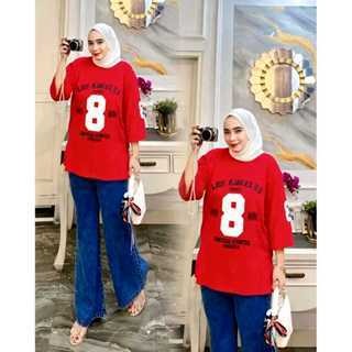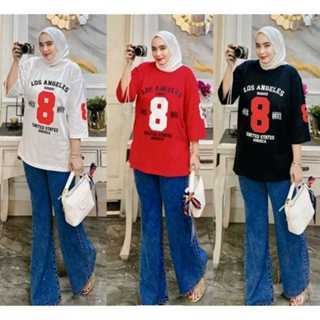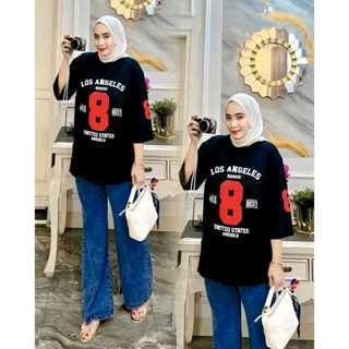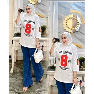 Setelan Kaos Wanita dan Celan Kulot Jeans Desain Angka 8 LOS ANGELES SOSOU Lengan Pendek Warna Putih Unisex Baju Distro Keren Casual Streetwear