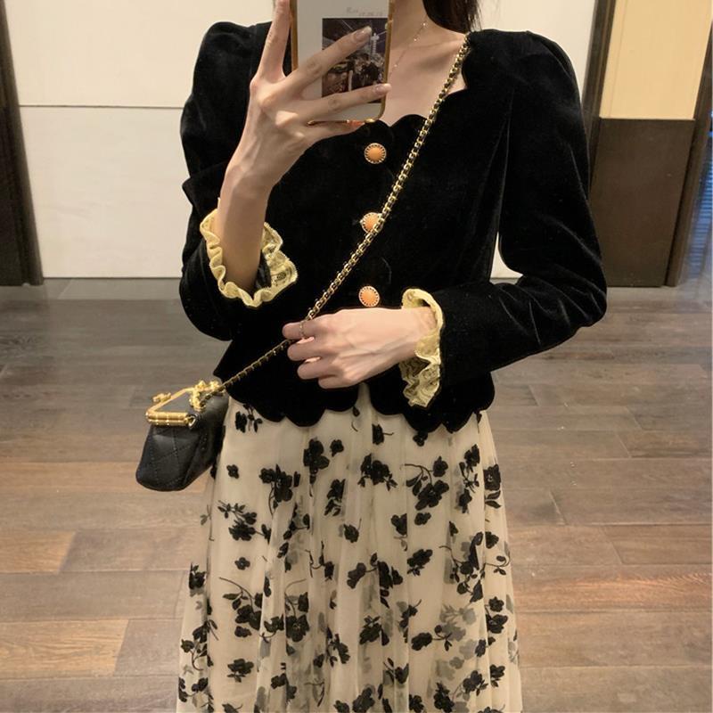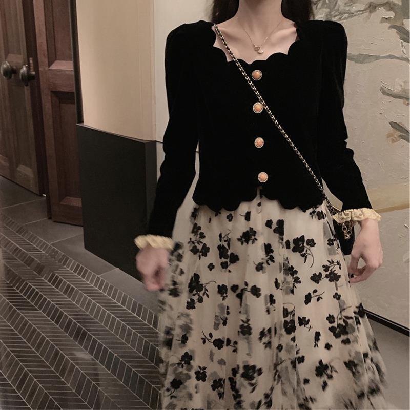 Setelan Kemeja Bawahan Beludru Kerah Persegi Hitam Wanita + Rok Jala