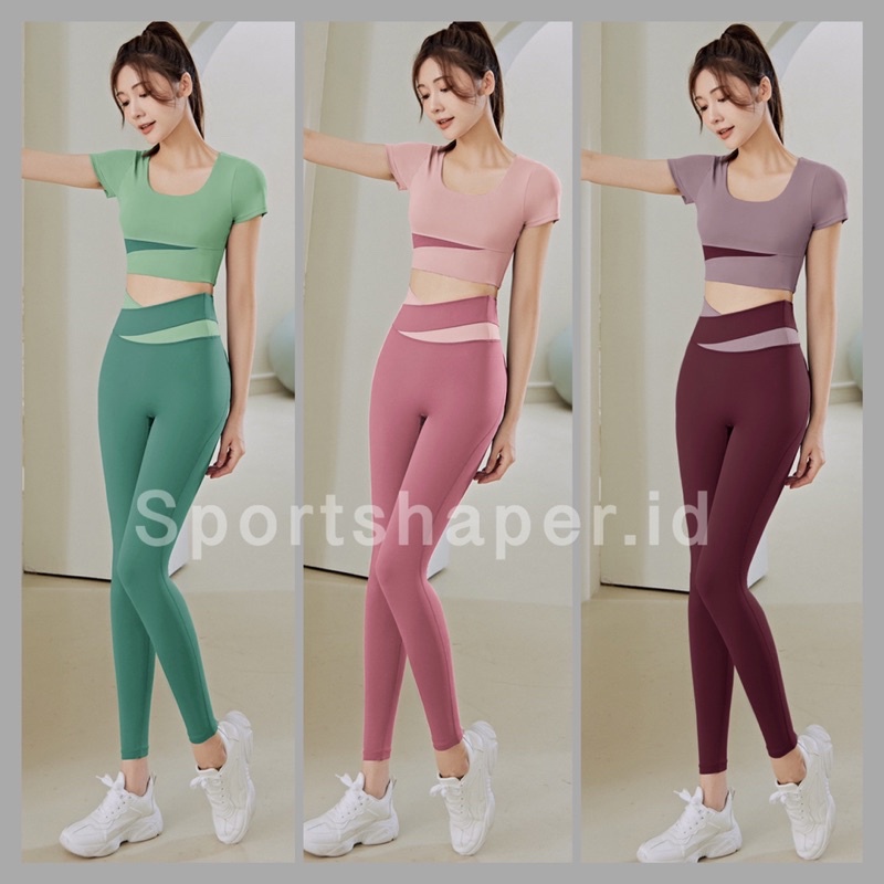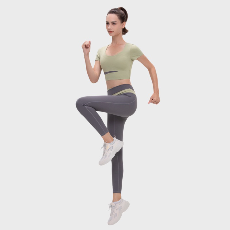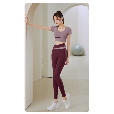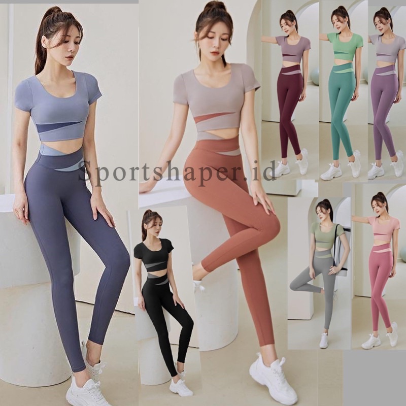 Setelan Olahraga Caramel Baju Lengan pendek+Legging Yoga Fitness Gym