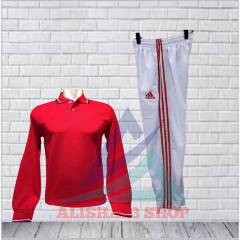 Setelan baju putih merah lengan panjang/ set training merah putih pria wanita/ setelan kaos kerah putih merah terbaru