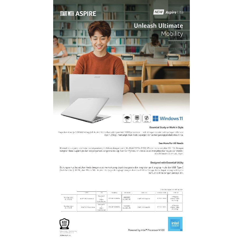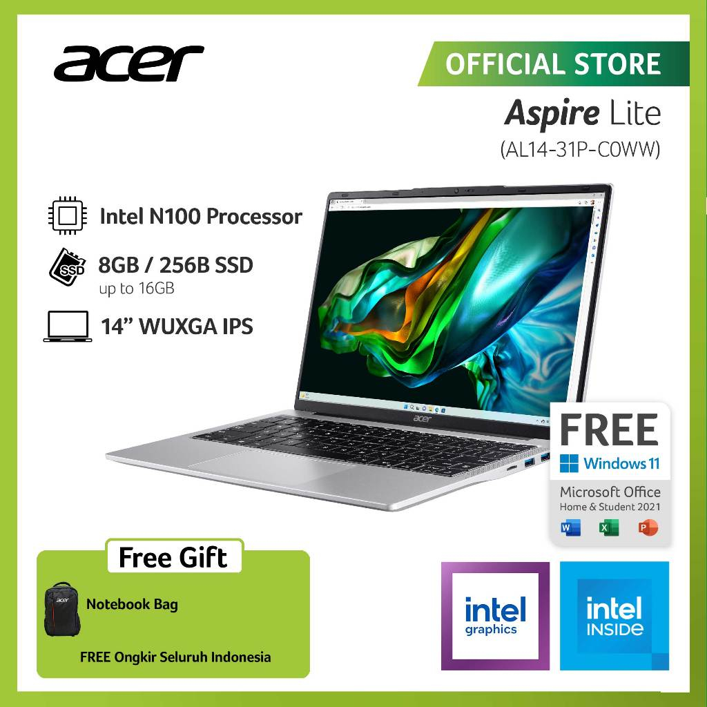ACER LAPTOP ASPIRE LITE AL14-31P-C3MH/AL14-31P-C0WW 14" WUXGA INTEL N100 RAM 8GB STORAGE 256GB SSD INTEL UHD GRAPHICS WINDOWS 11