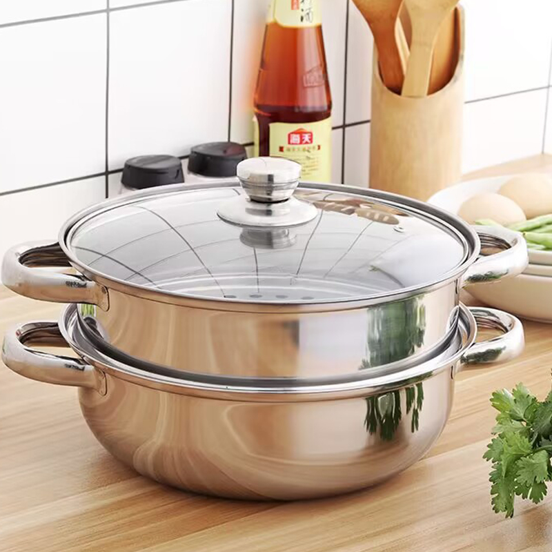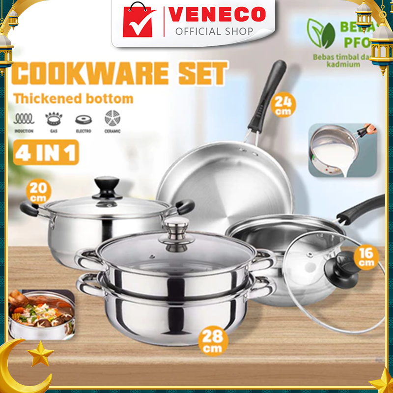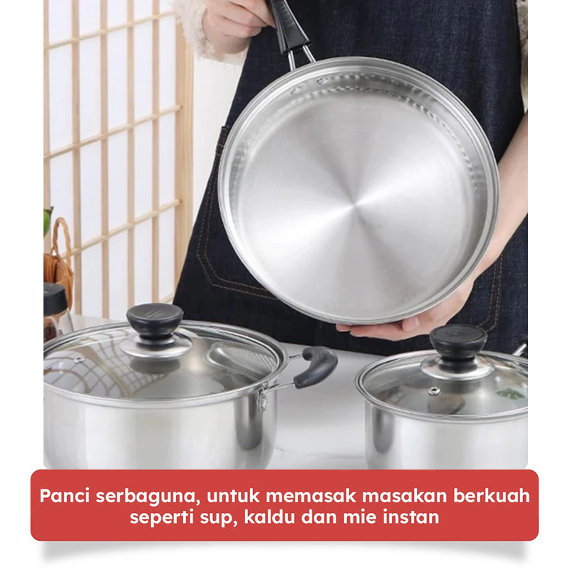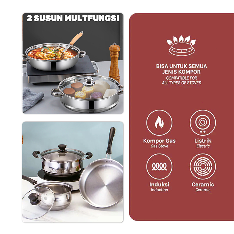PANCI STAINLESS STEEL 4 Set Panci dan Wajan Stainless Steel / Panci Kukus 28cm Panci Sup 22cm, Panci Mie 18cm, Wajan 26cm