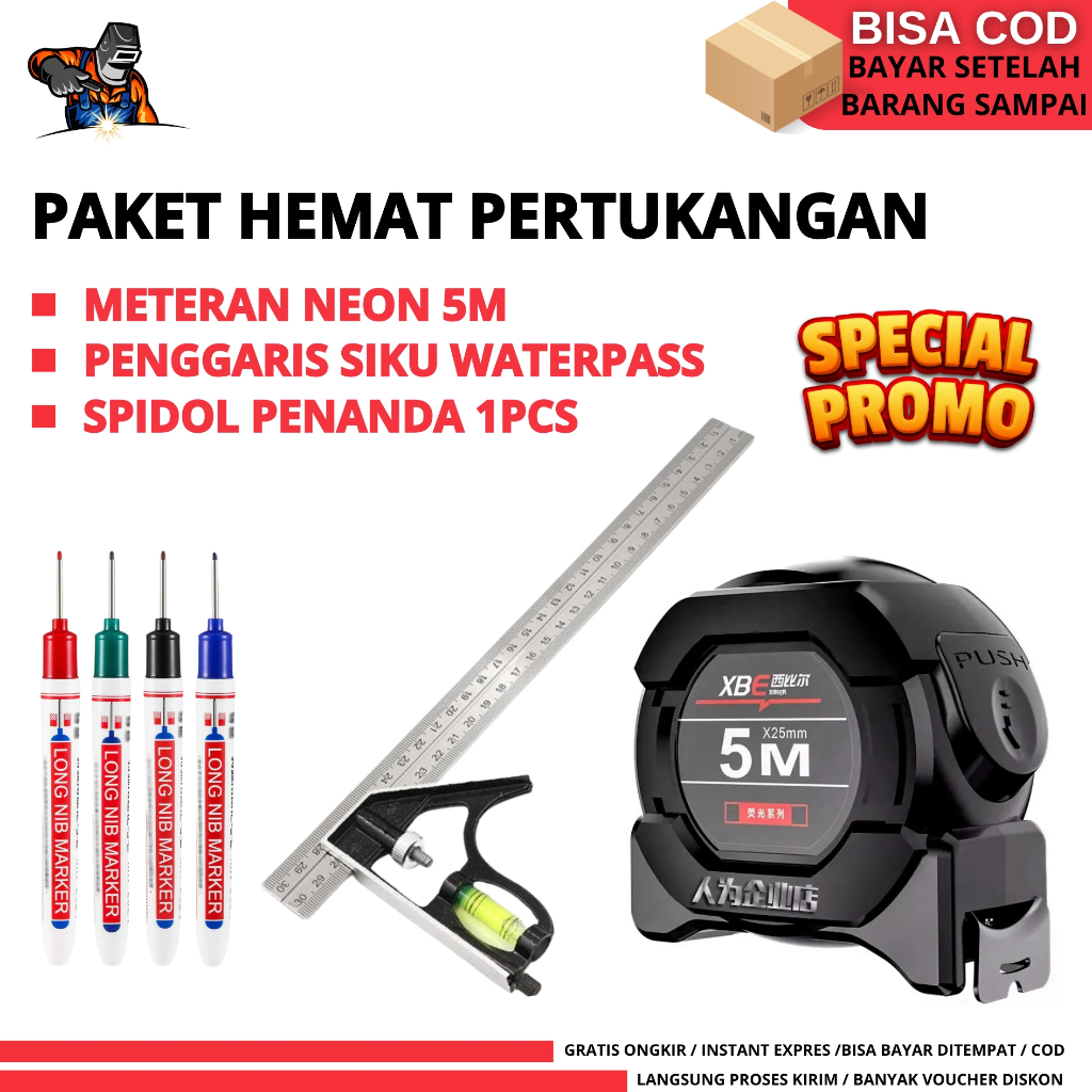 Meteran Pengukur Kelas Industri Presisi 5M / Pasekon Penggaris Siku Waterpass Pembuat Sudut 30cm / Spidol Pertukangan Kepala Panjang
