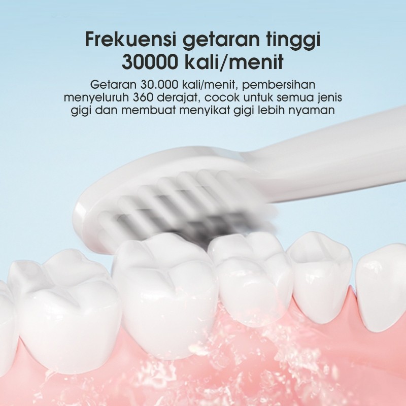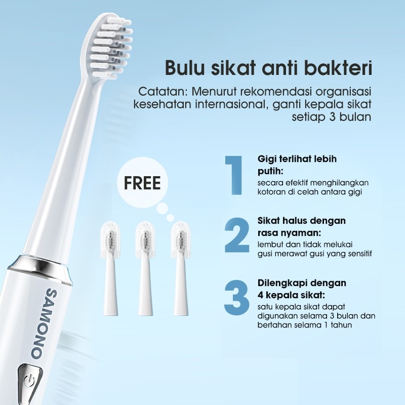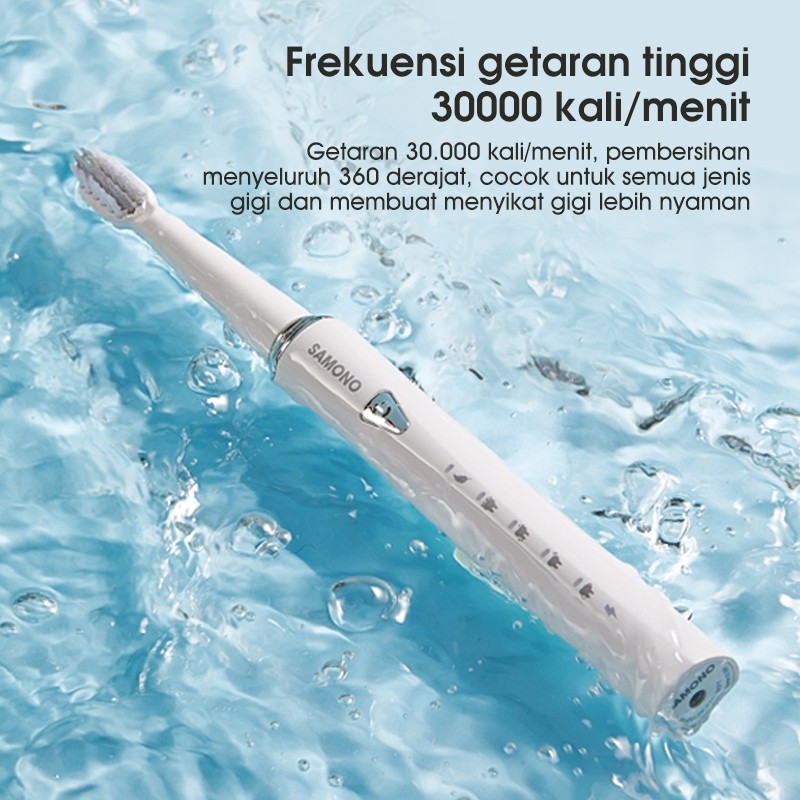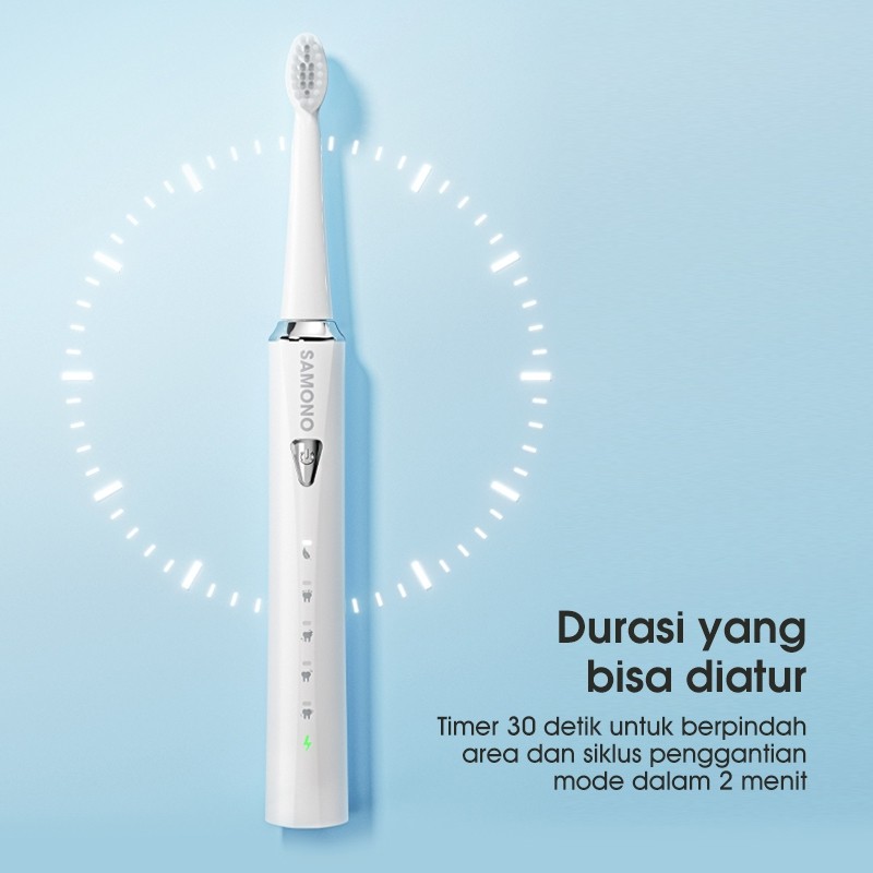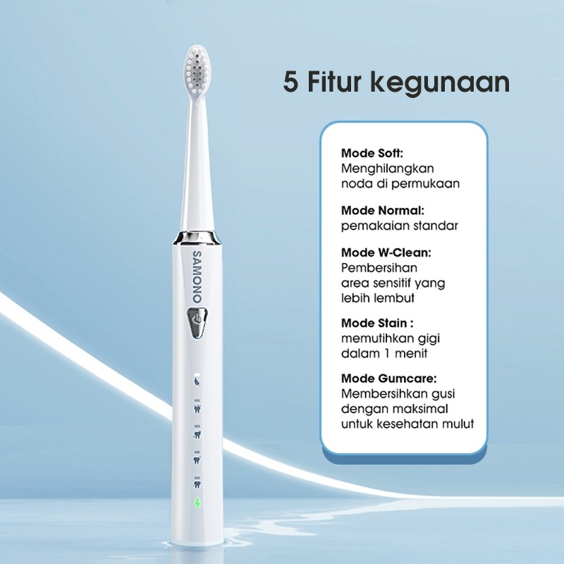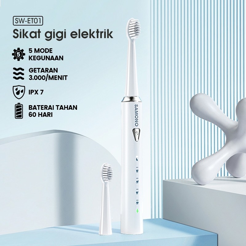 SAMONO Sikat Gigi Elektrik Baterai Tahan 60 Hari Free 3 Kepala Sikat, IPX7: Anti air, aman digunakan saat mandi atau dibilas di bawah air, 5 Mode Kegunaan, Soft, Normal, W-Clean, Stain, dan Gum Care. SW-ET01