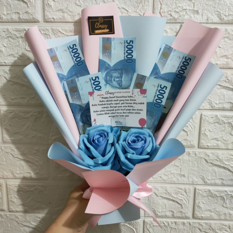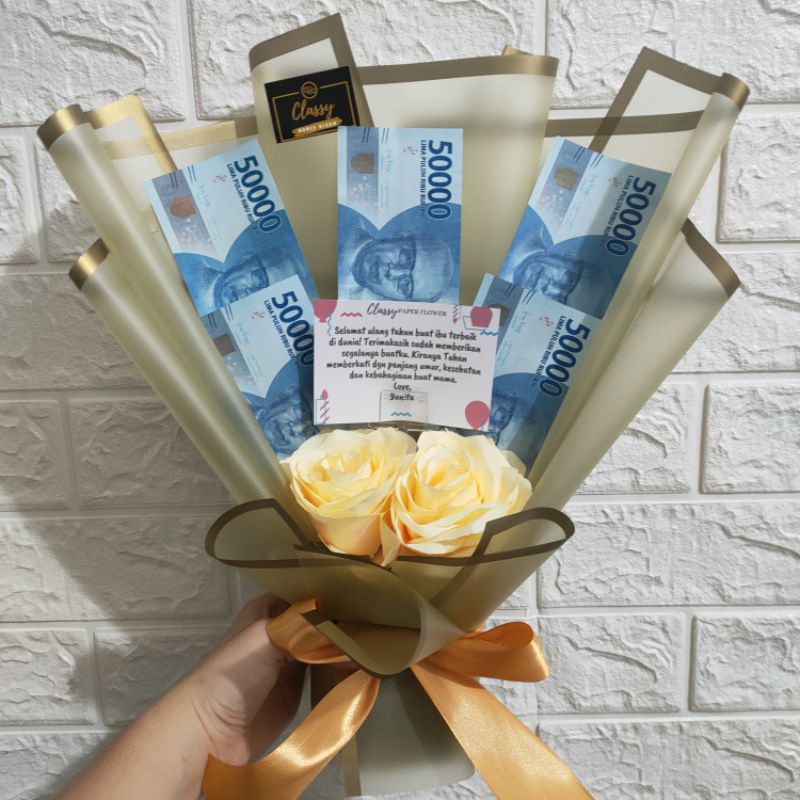 Small Standing Money Bouquet + 2 Bunga Artificial / Bucket Buket Bunga Uang Asli /Hadiah Ultah Anniv