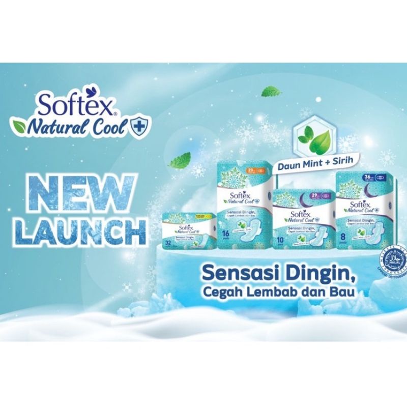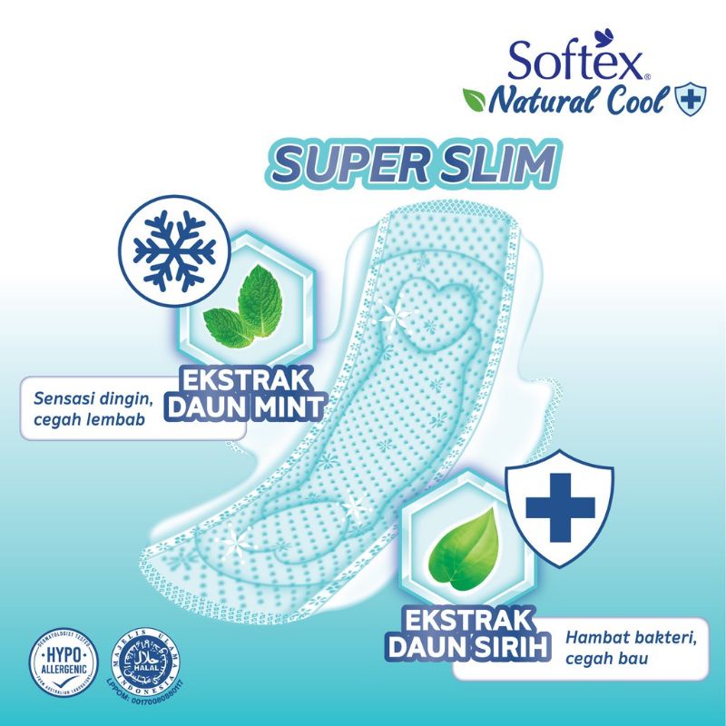 Softex Natural Cool + Super Slim dengan Daun Mint dan Sirih 23 cm 29 cm 36 cm / Pantyliner Softex Natural Cool + Super Slim dengan Daun Mint dan Sirih 15 cm / Pembalut Softex Natural Cool / Pantyliner Softex Natural Cool