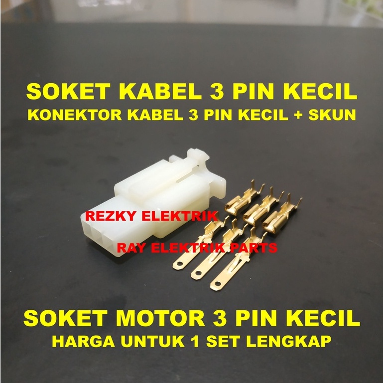 Soket 3 Pin KECIL 1 SET lengkap dengan Skun Kabel / Socket Kabel untuk Motor dan Mobil 3Pin