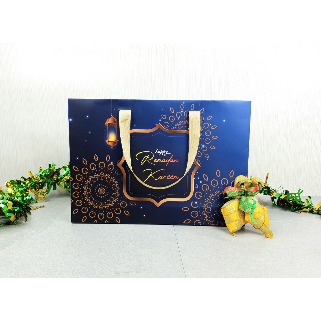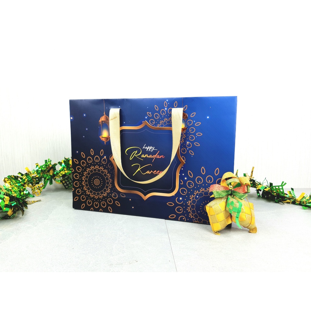 Souvenir Paperbag Kado Idul Fitri Hamper Ramadan Kareem Lebaran uk 32 x 22 x 7 cm cocok untuk Baju, Sarung, Mukena dll (Biru)
