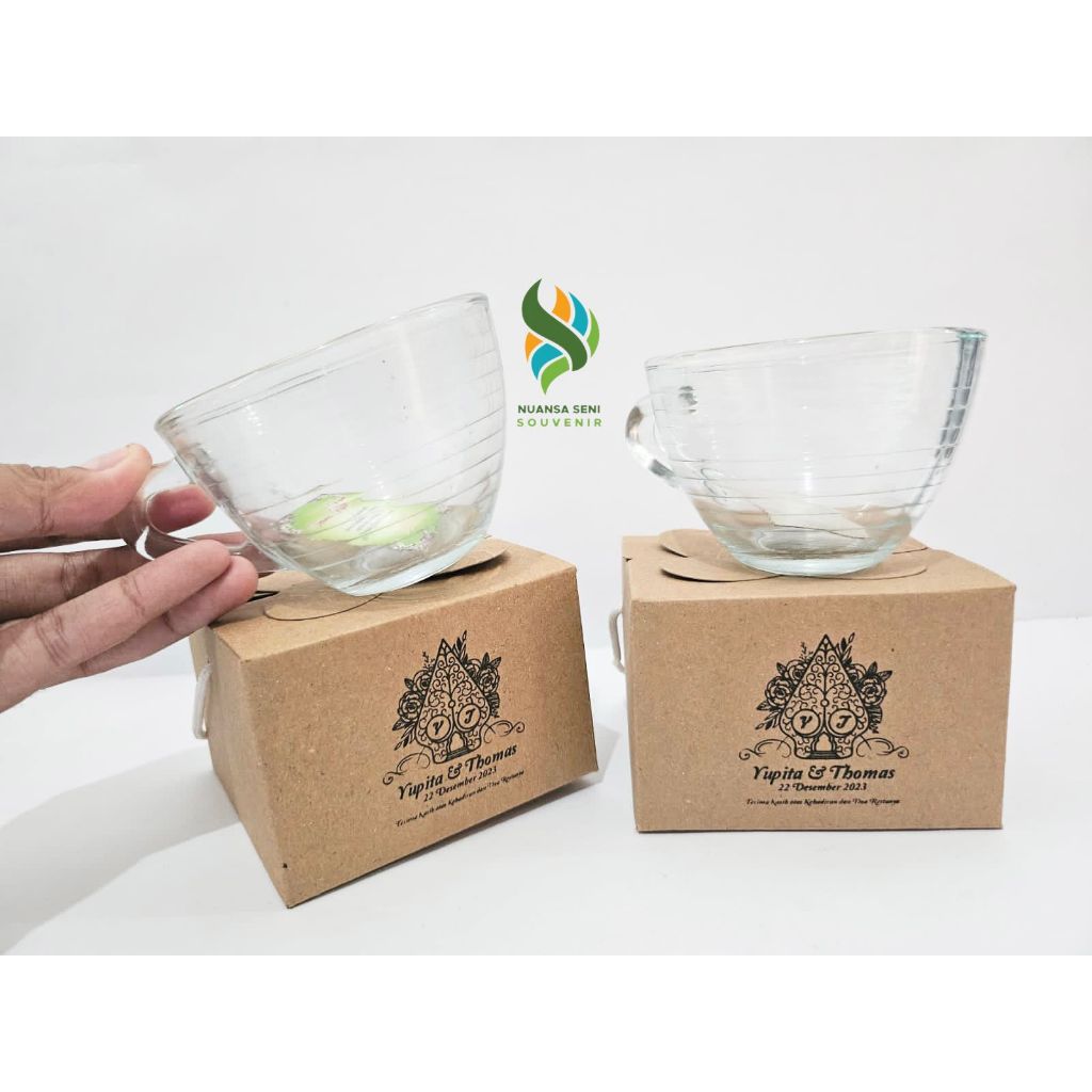 Souvenir Pernikahan Gelas Cangkir Sariwangi Mug Tea Gagang Kaca Estetik Sablon Custom