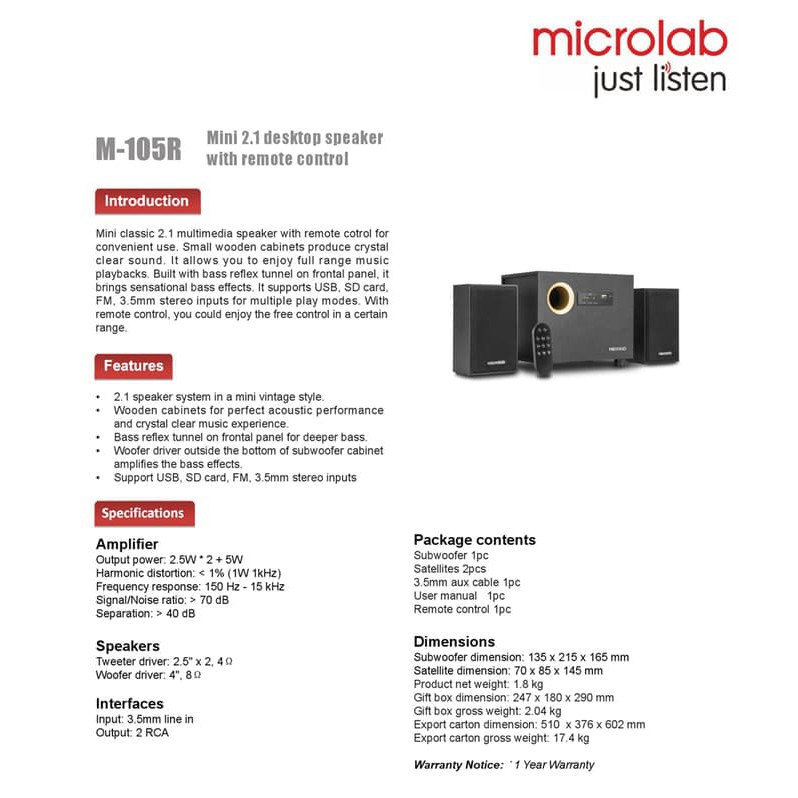 Speaker Multimedia Microlab M105R 2.1 Stereo With USB/SD Card