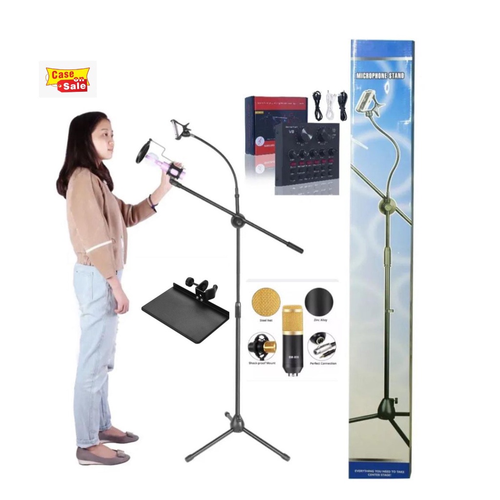 Stand Degree Microphone Stand With Tray LED STAND MICROPHONE WITH HOLDER COCOK UNTUK STUDIO MUSIK KONTEN PEMULA TRIPOD MICROPHONE STAND MIC PANJANG HP STAND KARAOKE STAND SMULE KAKI MIC STAND REKAMAN HOLDER MIC