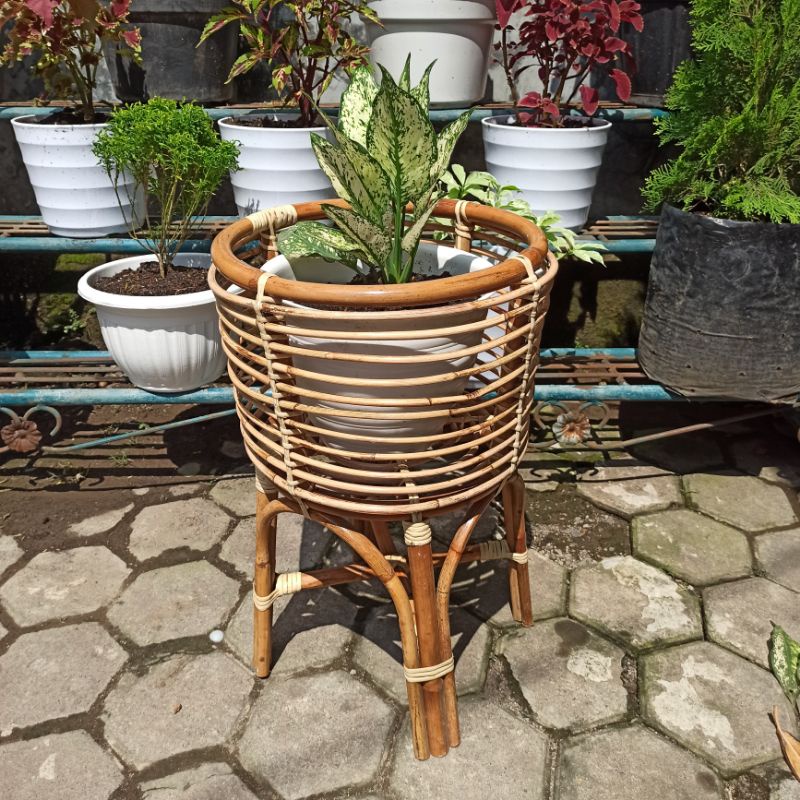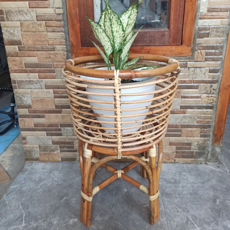 Pot Bunga Aesthetic Ruang tamu / Standing Pot Tanaman Bahan Rotan Alami sudah di Vernis
