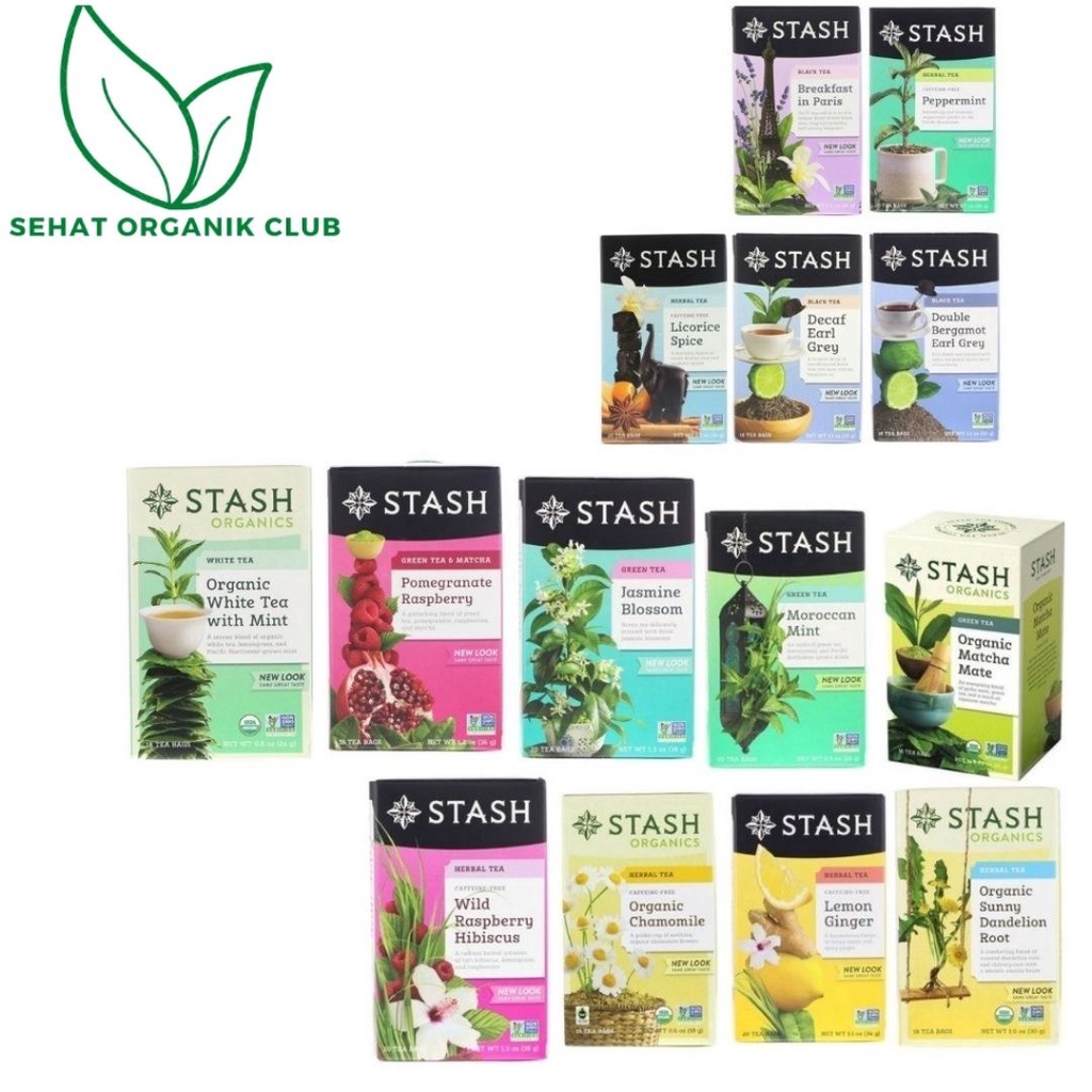 Stash Chamomile Tea; Moroccan Mint ; Matcha Mate ; Lemon Ginger ; Sunny Dandelion Root ; Jasmine Blossom ; Wild Raspberry Hibiscus ; Licorice Spice ; Decaf Earl Grey ; Double Bergamot Earl Grey ; Peppermint ; Breakfast in Paris ; White Tea ; Pomegranate