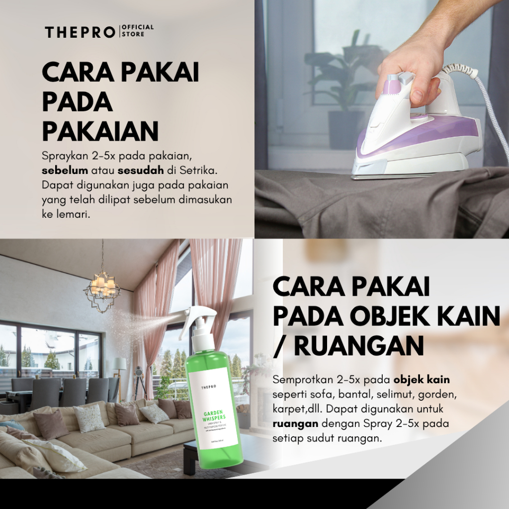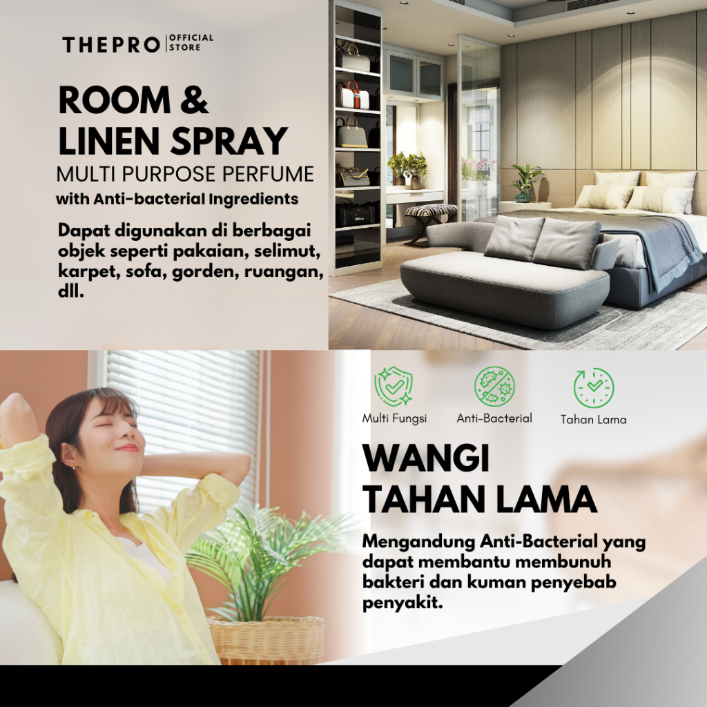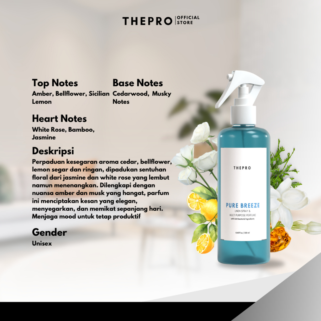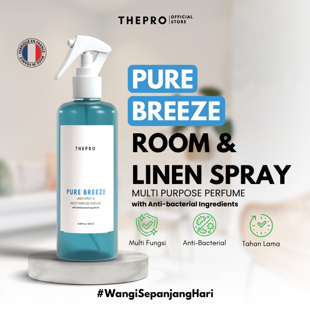 THEPRO Room & Linen Spray Pure Breeze 250ml - Pengharum Ruangan Anti Bakteri Wangi Mewah Tahan Lama & Multi Fungsi untuk Baju Sprei Sofa Kamar Mandi Kamar Tidur Tirai Helm Interior Mobil