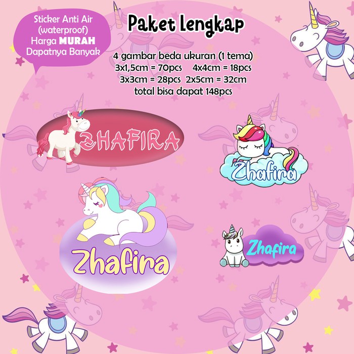 Sticker Nama Lucu/Custom/Kartun/Cartoon/Waterproof - UNICORN 95pc